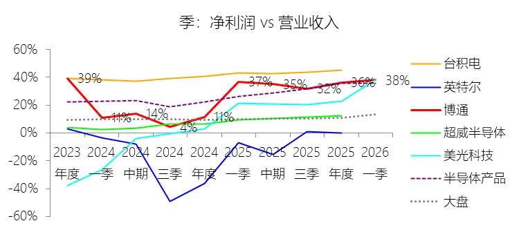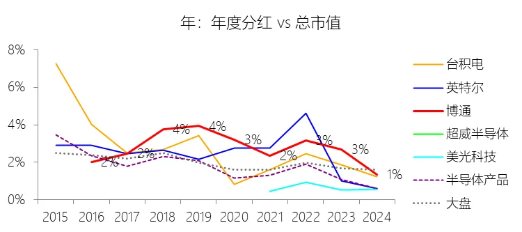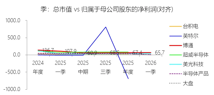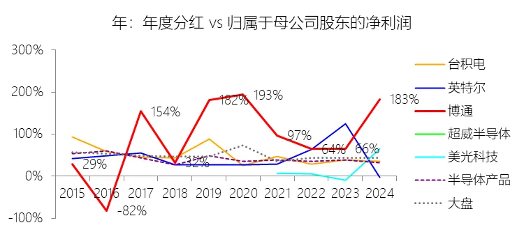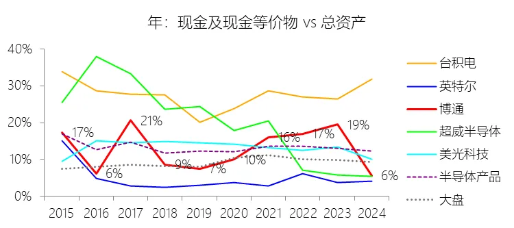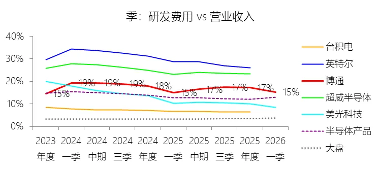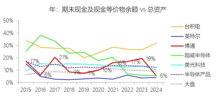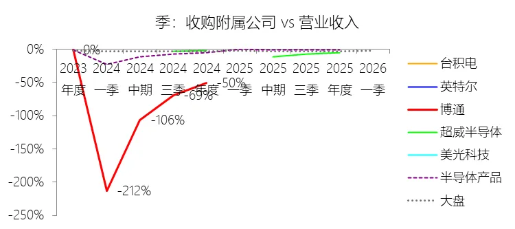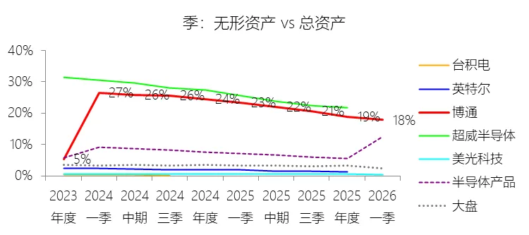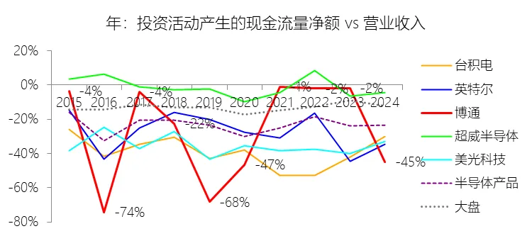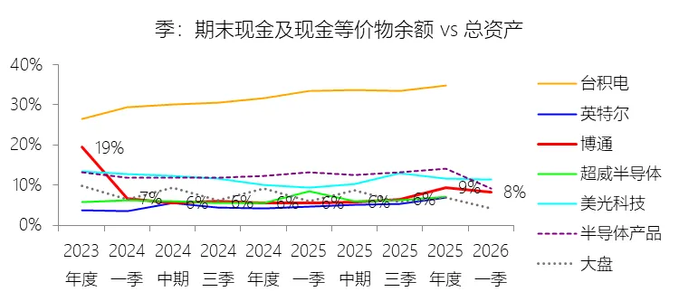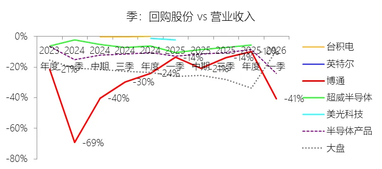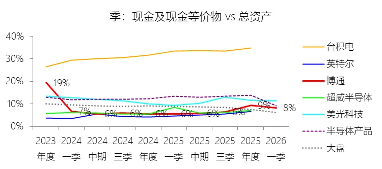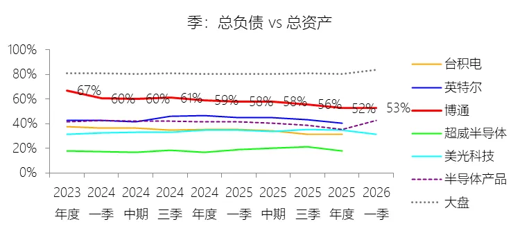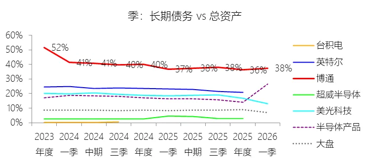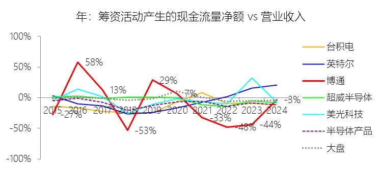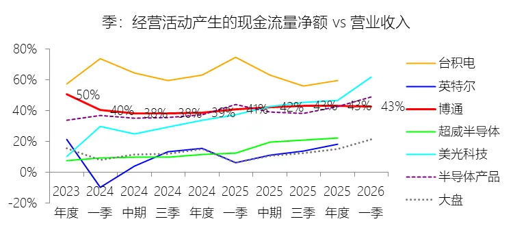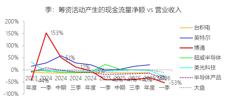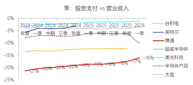 经营活动产生的现金流量净额:2026财年第一季,博通的经营活动产生的现金流量净额为82.60亿美元,同比增长35.12%,与营业收入的比例为42.77%,同比上升1.79个百分点;2015-2024财年(十年),此项合计为1114.65亿美元,平均比例为44.04%,比半导体产品行业的均值高7.75个百分点,长期呈上升趋势。比例短期上升主要由于归属于母公司股东净利润的稳健增长以及非现金调节项的显著增加;在2026财年第一季中,受定制AI加速器需求和VMware订阅模式转型的双重驱动,公司净利润同比增加18.46亿美元,表现强劲。同时,作为非现金支出的以股份为基础的补偿费用从去年同期的12.80亿美元激增至21.76亿美元,在现金流量表核算中作为加回项大幅提升了经营现金流的账面值。比例长期上升主要由于博通通过大规模并购实现了业务结构的战略升维,从传统半导体向高毛利、高经常性收入的基础设施软件领域(如CA、Symantec、VMware)大规模扩张,软件业务特有的订阅模式和VCF许可便携性(license portability)不仅提高了预收现金流,更通过显著低于硬件业务的运营成本持续优化了现金转化率。此外,随着并购规模扩大,巨额的无形资产摊销和股权激励等非现金科目长期作为净利润的加回项,使得经营现金流与营业收入的比例随业务规模扩大呈阶梯式上升。比例高于半导体产品行业的均值主要由于博通拥有独特的“半导体+软件”双轮驱动模式,其高利润的基础设施软件业务贡献了近半数营收,利润率远超主要由硬件构成的行业平均水平。同时,公司长期坚持“轻资产”的制造外包战略,避免了类似传统IDM厂商高昂的折旧和固定成本负担。此外,博通在新加坡和马来西亚长期享有的重大税收优惠政策,使其现金税收支出占营收的比例极低,从而在全球范围内维持了显著优于同行的现金产出水平。收购附属公司:2026财年第一季,博通的收购附属公司缺数据,与营业收入的比例无效;2015-2024财年(十年),此项合计为-684.79美元,平均比例为-27.06%,比半导体产品行业的均值低23.52个百分点,长期呈上升趋势。投资活动产生的现金流量净额:2026财年第一季,博通的投资活动产生的现金流量净额为-1.15亿美元,绝对值同比减少33.91%,与营业收入的比例为-0.60%,同比上升0.57个百分点;2015-2024财年(十年),此项合计为-666.31亿美元,平均比例为-26.33%,比半导体产品行业的均值低3.04个百分点,长期呈上升趋势。比例短期上升主要由于2026财年第一季中投资活动的现金流出绝对值显著收窄,尽管为支持研发项目及 Irvine 和 San Jose 园区的建设,公司在本季度的购建固定资产等支出(CapEx)从去年同期的1.00亿美元增加至2.50亿美元,但该项支出被高达2.44亿美元的出售投资收回现金(去年同期仅为1800万美元)所基本抵消;此外,该季度营业收入同比大幅增长29.47%,在投资净流出额减少的情况下,进一步拉升了该项占比。比例长期上升主要由于博通在过去十年间采取“大规模并购、深度整合、适时剥离”的资产优化策略,虽然完成对BRCM、CA及VMware等巨头的收购会导致特定年份出现数百亿美元的投资性现金巨额流出,但在非并购年份,公司的资本开支规模极小,且通过剥离非核心业务(如2024财年以35亿美元出售VMware终端用户计算业务,以及早年剥离BRCM和LSI的相关资产)获得了巨额现金回笼,这种阶段性的现金流入在长期跨度内有效对冲了投资活动的净支出水平。比例低于半导体产品行业的均值主要由于博通始终坚持“轻资产”的运营模式,将大部分前道晶圆制造业务外包给台积电(TSMC)等第三方代工厂,仅保留核心模拟及专利工艺产品的少量内部产能;相比于英特尔等依赖重资产扩张产能、每年需投入数百亿美元购建厂房设备的传统IDM厂商,博通在物业、厂房及设备上的投入强度极低,这导致其长期平均的投资活动现金流出占比显著高于(即绝对值低于)那些需负担高额制造资本开支的行业同行。新增借款:2026财年第一季,博通的新增借款为44.74亿美元,与营业收入的比例为23.17%,同比上升23.17个百分点;2015-2024财年(十年),此项合计为399.54亿美元,平均比例为15.79%,比半导体产品行业的均值高12.96个百分点。回购股份:2026财年第一季,博通的回购股份为-78.50亿美元,绝对值同比增长285.56%,与营业收入的比例为-40.65%,同比下降27个百分点;2015-2024财年(十年),此项合计为-443.17亿美元,平均比例为-17.51%,比半导体产品行业的均值低9.68个百分点,长期呈上升趋势。股息支付:2026财年第一季,博通的股息支付为-30.86亿美元,绝对值同比增长11.25%,与营业收入的比例为-15.98%,同比上升2.62个百分点;2015-2024财年(十年),此项合计为-434.70亿美元,平均比例为-17.18%,比半导体产品行业的均值低9.48个百分点,长期呈下降趋势。筹资活动产生的现金流量净额:2026财年第一季,博通的筹资活动产生的现金流量净额为-101.49亿美元,绝对值同比增长69.72%,与营业收入的比例为-52.56%,同比下降12.46个百分点;2015-2024财年(十年),此项合计为-370.90亿美元,平均比例为-14.66%,比半导体产品行业的均值低4.89个百分点,长期呈下降趋势。比例短期下降主要由于公司在2026财年第一季实施了力度空前的股东回报政策,其中股份回购支出从去年同期的零(不含代扣税相关回购)激增至78.50亿美元,且季度股息支付额也因每股派息额上调由27.74亿美元增加至30.86亿美元。尽管公司在该季度通过发行高级票据获得了44.74亿美元的融资流入,但仍