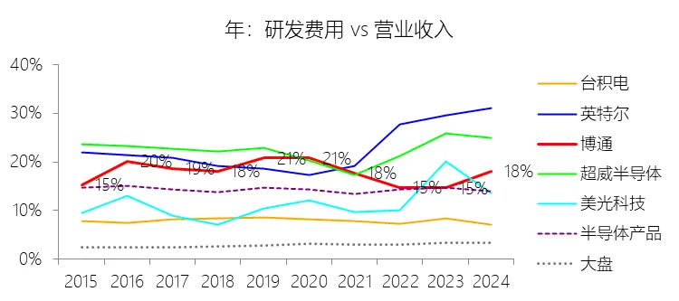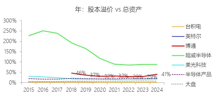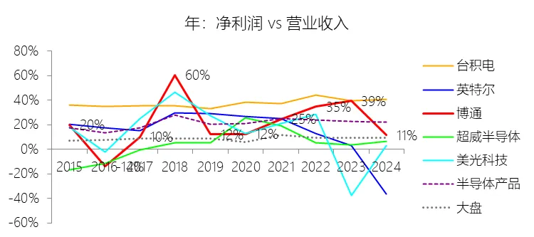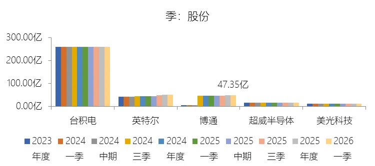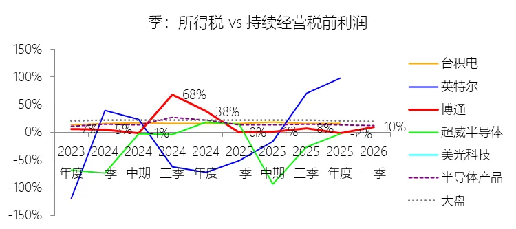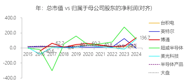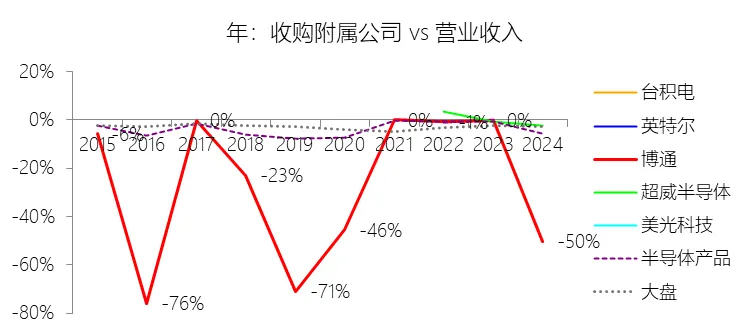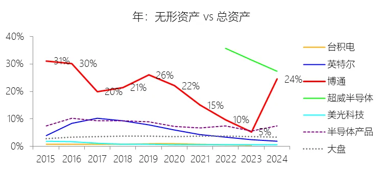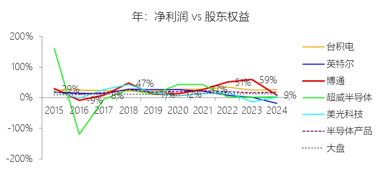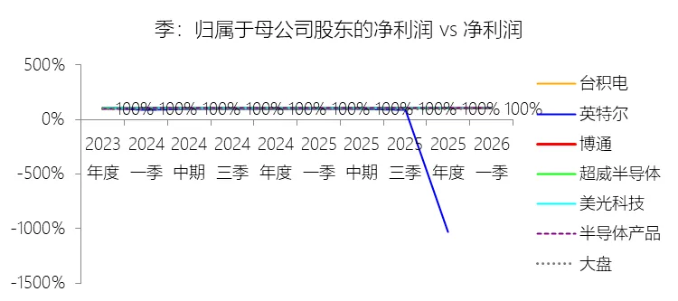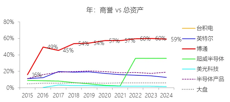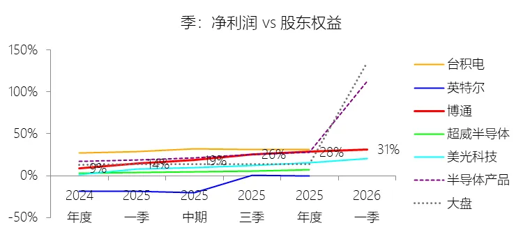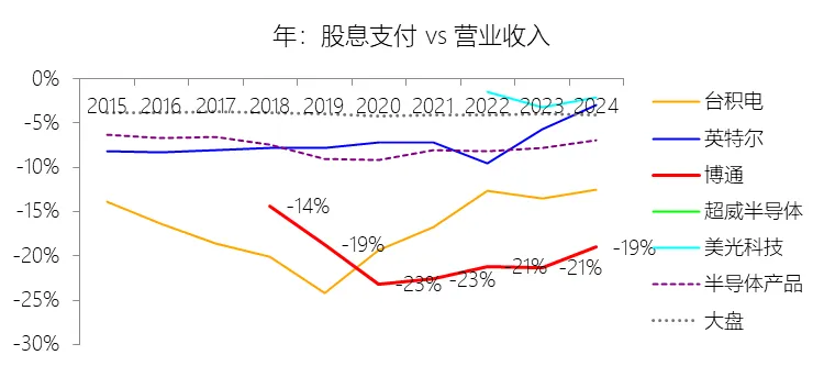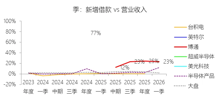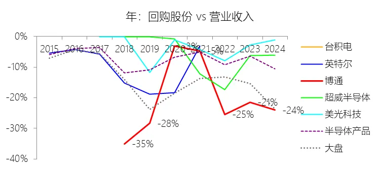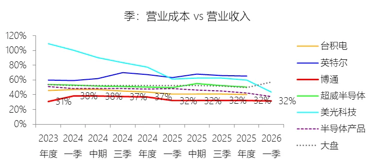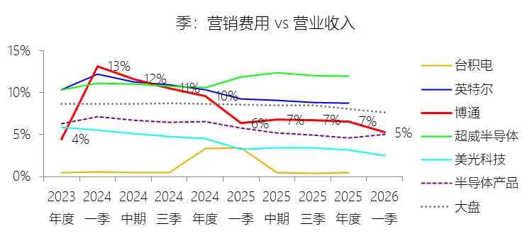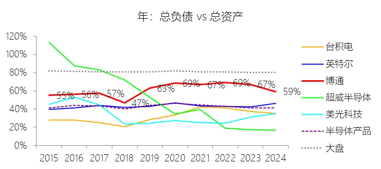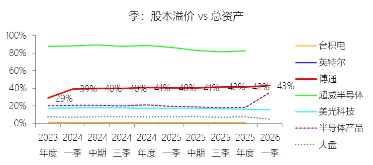 经营活动产生的现金流量净额:2026财年第一季,博通的经营活动产生的现金流量净额为82.60亿美元,同比增长35.12%,与营业收入的比例为42.77%,同比上升1.79个百分点;2015-2024财年(十年),此项合计为1114.65亿美元,平均比例为44.04%,比半导体产品行业的均值高7.75个百分点,长期呈上升趋势。比例短期上升主要由于归属于母公司股东净利润的稳健增长以及非现金调节项的显著增加;在2026财年第一季中,受定制AI加速器需求和VMware订阅模式转型的双重驱动,公司净利润同比增加18.46亿美元,表现强劲。同时,作为非现金支出的以股份为基础的补偿费用从去年同期的12.80亿美元激增至21.76亿美元,在现金流量表核算中作为加回项大幅提升了经营现金流的账面值。比例长期上升主要由于博通通过大规模并购实现了业务结构的战略升维,从传统半导体向高毛利、高经常性收入的基础设施软件领域(如CA、Symantec、VMware)大规模扩张,软件业务特有的订阅模式和VCF许可便携性(license portability)不仅提高了预收现金流,更通过显著低于硬件业务的运营成本持续优化了现金转化率。此外,随着并购规模扩大,巨额的无形资产摊销和股权激励等非现金科目长期作为净利润的加回项,使得经营现金流与营业收入的比例随业务规模扩大呈阶梯式上升。比例高于半导体产品行业的均值主要由于博通拥有独特的“半导体+软件”双轮驱动模式,其高利润的基础设施软件业务贡献了近半数营收,利润率远超主要由硬件构成的行业平均水平。同时,公司长期坚持“轻资产”的制造外包战略,避免了类似传统IDM厂商高昂的折旧和固定成本负担。此外,博通在新加坡和马来西亚长期享有的重大税收优惠政策,使其现金税收支出占营收的比例极低,从而在全球范围内维持了显著优于同行的现金产出水平。收购附属公司:2026财年第一季,博通的收购附属公司缺数据,与营业收入的比例无效;2015-2024财年(十年),此项合计为-684.79美元,平均比例为-27.06%,比半导体产品行业的均值低23.52个百分点,长期呈上升趋势。投资活动产生的现金流量净额:2026财年第一季,博通的投资活动产生的现金流量净额为-1.15亿美元,绝对值同比减少33.91%,与营业收入的比例为-0.60%,同比上升0.57个百分点;2015-2024财年(十年),此项合计为-666.31亿美元,平均比例为-26.33%,比半导体产品行业的均值低3.04个百分点,长期呈上升趋势。比例短期上升主要由于2026财年第一季中投资活动的现金流出绝对值显著收窄,尽管为支持研发项目及 Irvine 和 San Jose 园区的建设,公司在本季度的购建固定资产等支出(CapEx)从去年同期的1.00亿美元增加至2.50亿美元,但该项支出被高达2.44亿美元的出售投资收回现金(去年同期仅为1800万美元)所基本抵消;此外,该季度营业收入同比大幅增长29.47%,在投资净流出额减少的情况下,进一步拉升了该项占比。比例长期上升主要由于博通在过去十年间采取“大规模并购、深度整合、适时剥离”的资产优化策略,虽然完成对BRCM、CA及VMware等巨头的收购会导致特定年份出现数百亿美元的投资性现金巨额流出,但在非并购年份,公司的资本开支规模极小,且通过剥离非核心业务(如2024财年以35亿美元出售VMware终端用户计算业务,以及早年剥离BRCM和LSI的相关资产)获得了巨额现金回笼,这种阶段性的现金流入在长期跨度内有效对冲了投资活动的净支出水平。比例低于半导体产品行业的均值主要由于博通始终坚持“轻资产”的运营模式,将大部分前道晶圆制造业务外包给台积电(TSMC)等第三方代工厂,仅保留核心模拟及专利工艺产品的少量内部产能;相比于英特尔等依赖重资产扩张产能、每年需投入数百亿美元购建厂房设备的传统IDM厂商,博通在物业、厂房及设备上的投入强度极低,这导致其长期平均的投资活动现金流出占比显著高于(即绝对值低于)那些需负担高额制造资本开支的行业同行。新增借款:2026财年第一季,博通的新增借款为44.74亿美元,与营业收入的比例为23.17%,同比上升23.17个百分点;2015-2024财年(十年),此项合计为399.54亿美元,平均比例为15.79%,比半导体产品行业的均值高12.96个百分点。回购股份:2026财年第一季,博通的回购股份为-78.50亿美元,绝对值同比增长285.56%,与营业收入的比例为-40.65%,同比下降27个百分点;2015-2024财年(十年),此项合计为-443.17亿美元,平均比例为-17.51%,比半导体产品行业的均值低9.68个百分点,长期呈上升趋势。股息支付:2026财年第一季,博通的股息支付为-30.86亿美元,绝对值同比增长11.25%,与营业收入的比例为-15.98%,同比上升2.62个百分点;2015-2024财年(十年),此项合计为-434.70亿美元,平均比例为-17.18%,比半导体产品行业的均值低9.48个百分点,长期呈下降趋势。筹资活动产生的现金流量净额:2026财年第一季,博通的筹资活动产生的现金流量净额为-101.49亿美元,绝对值同比增长69.72%,与营业收入的比例为-52.56%,同比下降12.46个百分点;2015-2024财年(十年),此项合计为-370.90亿美元,平均比例为-14.66%,比半导体产品行业的均值低4.89个百分点,长期呈下降趋势。比例短期下降主要由于公司在2026财年第一季实施了力度空前的股东回报政策,其中股份回购支出从去年同期的零(不含代扣税相关回购)激增至78.50亿美元,且季度股息支付额也因每股派息额上调由27.74亿美元增加至30.86亿美元。尽管公司在该季度通过发行高级票据获得了44.74亿美元的融资流入,但仍