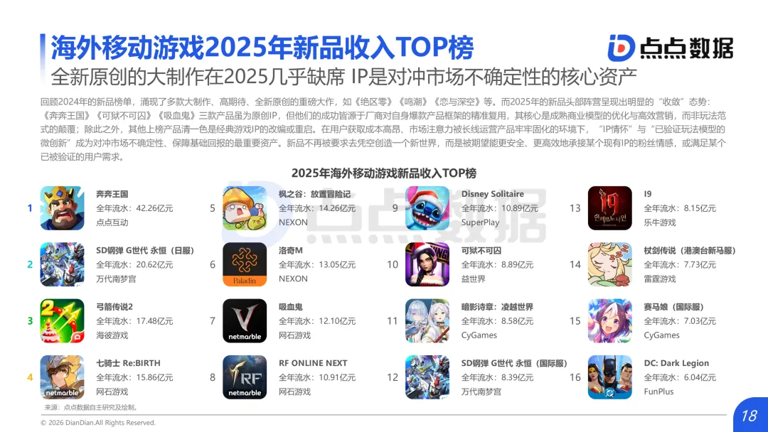 区域上没什么大的意外,美国和日本依然是核心市场,两者合计占据了超过50%的收入份额,港澳台市场则呈现腰部力量增强、竞争更均衡的态势。产品端变化比较明显,原创IP大作基本缺席,厂商不再盲目追求全新突破,转而聚焦经典IP改编和成熟模型的微创新,降低风险的同时贴合市场需求。另外,美日地区开放第三方支付,也悄悄重塑了当地的渠道规则,加上App Store下载占比升至26%,高价值用户向iOS生态聚集,渠道格局也在慢慢调整。