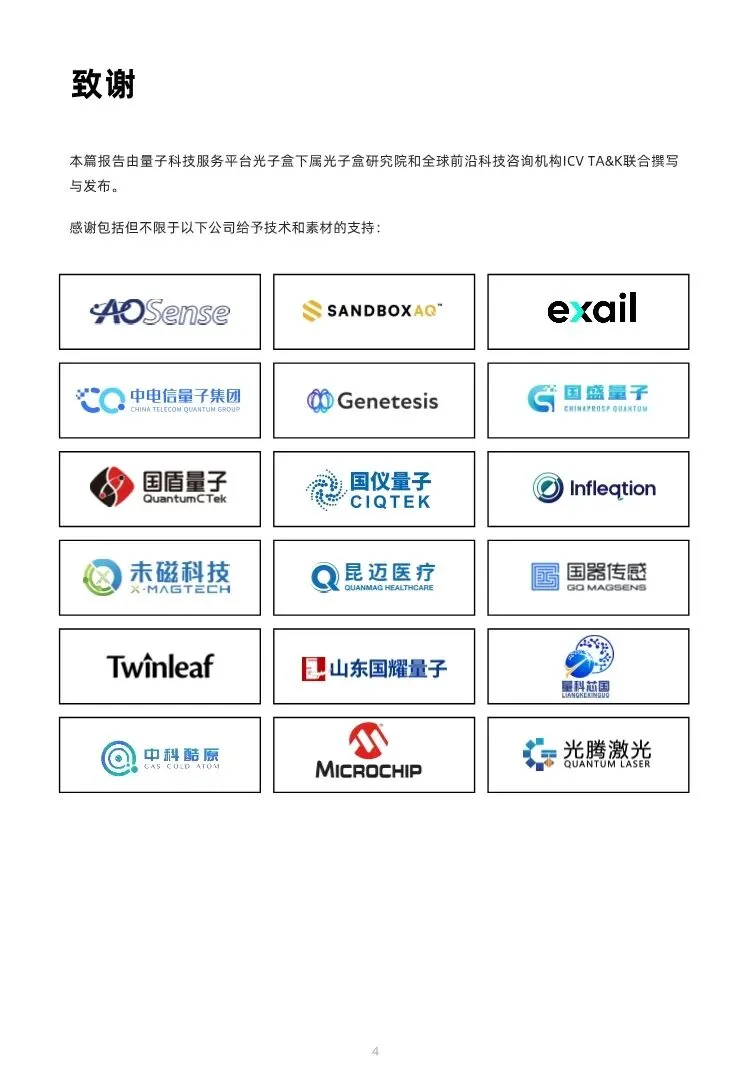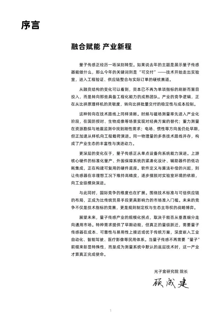 这份报告是光子盒研究院对全球量子传感产业在2025-2026年关键节点的一次系统性、全景式扫描。其核心价值在于,它不仅梳理了各细分技术路线的进展,更深刻地揭示了产业正在经历的一场从“原理验证”到“工程交付”、从“比拼参数”到“构建系统”的范式转型,并为未来十年的发展趋势提供了清晰的预测框架。报告开篇序言即点明了当前产业发展的核心特征——“转型”。具体体现在四个维度:1. 发展阶段转型:从“展示能做什么”(技术可行性)转向“可交付”技术(工程可用性),进入工程验证、供应链整合与获取实际订单的“硬核赛道”。2. 竞争逻辑转型:资本与竞争焦点从比拼原理样机的极限灵敏度,转向比拼批量交付的稳定性、成本控制与工程化能力。3. 产品形态转型:从依赖实验室环境的单点精密设备,向具备系统能力、软件定义、环境自适应的工业级模块演进。上游硬件的标准化量产是此转型的基石。4. 竞争维度转型:国际竞争从单纯的技术指标竞赛,扩展到围绕技术标准、可信供应链和生态主导权的战略博弈。报告第一章勾勒了2025年产业的整体图景,呈现出一个多层次、差异化演进的生态系统。 ◦ 成长期:时频测量(原子钟)和磁场测量(量子磁力计)已率先实现商业化,在国防、科研、生物医疗领域实现对经典方案的替代。 ◦ 起步期:重力测量(重力仪)在资源勘探、地震监测中找到刚性需求,电场测量等正从样机向工程原型跨越。 ◦ 萌芽期:惯性、应力应变、温度等测量方向,性能优势尚未完全显现,处于早期研发阶段。 ◦ 核心洞察:产业遵循渐进式发展规律,成熟技术拓展应用边界,新兴技术储备未来动能。 ◦ 全球产业规模预计从2025年的18.8亿美元增长至2035年的50.7亿美元(CAGR 10.42%),进入稳步增长通道。 ◦ 当前增长主要依靠军事国防等高价值特种需求驱动(占下游应用近50%),民用市场渗透率低。报告明确指出,产业实现量级跃迁的关键,在于能否成功向大规模通用市场(工业自动化、智能驾驶等)跨越。 ◦ 2025年全球融资额大幅收缩(同比下降55.2%),但单笔融资强度向具备工程化交付能力的头部企业高度集中(如Infleqtion单轮1亿美元融资占全年62%)。 ◦ 这标志着资本逻辑从“为梦想买单”转向“为交付能力买单”,行业进入以工程可靠性、成本控制和商业价值验证为核心的“产业化攻坚期”。三、 技术链深度剖析:上游决定下限,系统集成决定上限报告用大量篇幅(第二至六章)系统剖析了从上游核心组件到下游应用的全产业链。1. 上游核心组件:硬件标准化是产业化的前提。报告指出,激光器、原子气室、探测器等核心硬件的性能直接决定了传感器的精度上限与工程可行性。当前趋势是制造工艺从手工制备转向晶圆级MEMS批量生产,外围保障系统(低温、真空、磁屏蔽)则向紧凑化、低功耗、高集成演进,以支撑传感器走出实验室,适配车载、船载等动态平台。 ◦ 磁场测量:SERF原子磁力计和NV色心磁力计是两大明星方向。SERF凭借常温、可穿戴优势,正在推动脑磁图(MEG)医疗设备进入“无液氦”时代(中国企业如未磁科技、昆迈医疗已获医疗器械注册证)。NV色心则凭借纳米级空间分辨率和固态集成潜力,在半导体检测、微观磁成像领域前景广阔。 ◦ 时频测量:原子钟是商业化最成熟的领域。微波原子钟(铷、铯钟)是市场主力;光钟在实验室不断刷新精度极限(如NIST单离子光钟不确定度达5.5×10⁻¹⁹),为未来下一代导航和基础物理研究储备技术;核钟(如钍-229)研究从理论走向工程验证,代表更长远的技术方向。 ◦ 重力测量:冷原子干涉重力仪是绝对重力测量的革命性工具,具备长期零漂移、无需校准的优势。已在野外监测、海上导航验证中展现价值(如Q-CTRL海上实验)。其当前挑战在于成本、体积和在动态环境中的稳定性。 ◦ 其他物理量:电场测量(里德堡原子传感)、惯性测量(量子陀螺仪/加速度计)、位移/相位测量(量子雷达)等方向仍处于工程化早期,但增速预期高,是未来产业扩张的潜力领域。3. 软件与算法的关键作用:报告单独设立章节强调,AI与量子控制算法正成为提升传感器环境鲁棒性的核心。通过实时噪声抑制、动态补偿和“软件定义”架构,算法能让传感器在非理想工况下维持高精度,降低对极致硬件和环境控制的依赖,这是工程化落地的关键赋能因素。报告第七章明确指出,量子领域的国际协作表现出明显的阵营化协同。• 西方阵营:以美国为主导,通过《科技繁荣协议》(与英、日、韩)、G7《量子技术未来共同愿景》等,构建排他性的技术同盟与可信供应链体系,并将技术领先与国防安全深度捆绑。• 中国体系:通过持续投入和举国体制,培育出全球领军企业,形成了与西方并行的技术体系和产业生态。• 核心洞察:全球量子竞争已演变为一场关于科技与工业标准、生产能力及供应链控制权的全面对抗。未来的市场准入,将越来越受地缘政治规则和技术标准互认的影响。报告最后章节提出了五大产业展望,实质上也指出了未来发展的关键路径与挑战:1. 驱动逻辑转变:从“技术推动”转向“需求牵引”,特别是国防、基础设施等领域的政府采购和首批订单,将成为企业跨越“死亡谷”、积累工程能力的关键。2. 软件定义与智能制造:性能提升更多依赖算法补偿;制造模式需从实验室定制转向标准化、模块化的工业化生产,以降低成