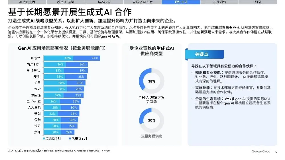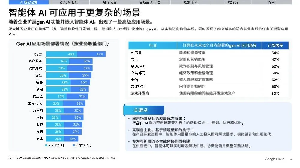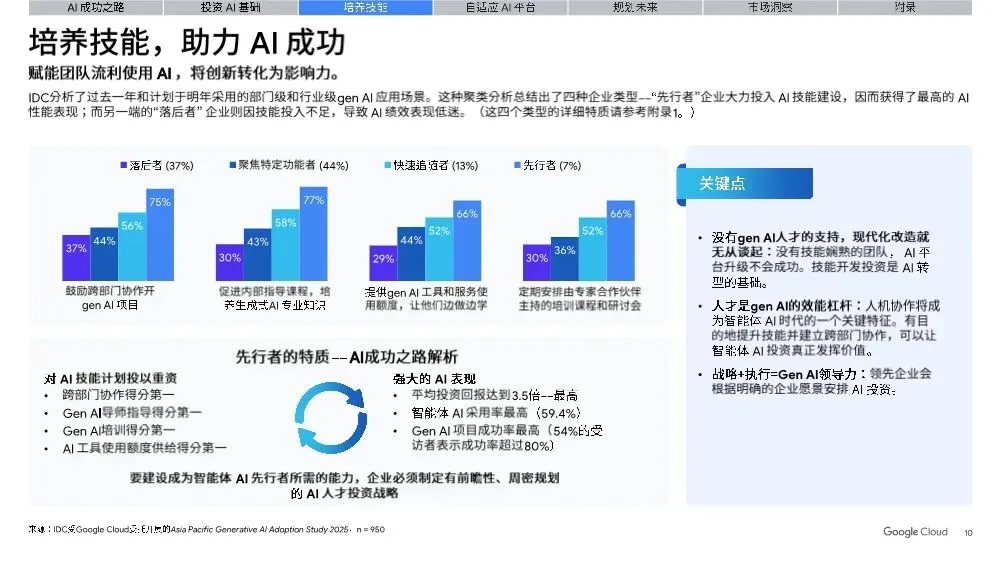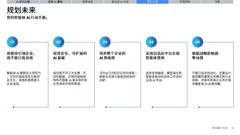 这份由Google Cloud发布、IDC参与研究的《2026智能体驱动的变革:企业增长新蓝海》白皮书,是一份具有前瞻性和战略指导意义的企业AI应用指南。它系统性地阐述了生成式AI(GenAI)向智能体AI(Agentic AI)演进的时代趋势,并为企业领导者提供了具体的行动框架。以下是对该白皮书的详细解读与分析:白皮书开宗明义地指出,智能体AI代表着一场“重新定义规则”的变革。它与之前的数字化转型或传统AI应用有本质区别:• 能力跃迁:AI从“支持决策”进化为“推动决策的执行”。智能体AI具备观察、推理和行动的能力,能够将战略目标转化为可执行的任务并自主完成。• 价值升级:企业应用AI的目标从“降本增效”升级为“驱动创新和增长”,通过实现规模化的自主能力来创造新价值。1. 智能体AI是必然的进化方向,并已进入规模化部署前夜• 数据支撑:调查显示,到2025年,约76%的亚太企业将在职能部门中部署智能体AI场景。在中国市场,这一趋势更为迅猛,55%的企业计划在未来12个月内部署,届时总采用率将达到惊人的80%。• 应用深化:智能体AI的应用从简单的任务自动化(如内容生成)转向复杂的成果驱动型自主编排(如实时供应链优化、跨部门营销活动执行)。白皮书为企业规划了清晰的行动路径,构成了成功的四大基石: ◦ 安全是首要关切:未来一年,安全和合规是企业最优先的AI投资领域。智能体AI的自主性带来了新的风险(如数据泄露、隐蔽攻击面),必须建立嵌入各层的安全架构和始终在线的人工治理。 ◦ 数据是核心燃料:数据工程的重要性从过去一年的第四位跃升至未来一年的第二位。没有高质量、治理完善的数据,智能体AI将无法有效工作。企业需优先投资数据现代化,构建“AI就绪”的数据基础。 ◦ 文档将企业分为四类:先行者(7%)、快速追随者(13%)、聚焦特定功能者(44%)、落后者(37%)。其中,“先行者”在AI技能建设上投入最重,其AI投资回报率(3.5倍)和项目成功率也最高。 ◦ 关键结论:人机协作是智能体时代的关键。投资于员工的AI技能提升(如培训、内部指导、提供使用额度),是AI转型的基础,能将技术投资转化为真正的业务影响力。 ◦ 平台是突破“试点困局”的关键:拥有GenAI平台的企业,在生产中部署智能体AI的成功率几乎翻倍。平台能安全地规模化集成模型、数据和编排,加速智能体工作流的实施。 ◦ 供应商选择倾向:38% 的企业青睐能提供模型、工具、基础设施与治理一体化平台的全栈AI解决方案供应商(如Google Cloud)。企业应选择具备端到端能力、生态系统强大且具有战略合作价值的伙伴。 ◦ 企业领导者需从战略高度出发,将智能体AI与核心业务目标对齐,设计能“前瞻性重塑业务模式”的应用场景,而不仅仅是追求局部效率提升。白皮书特别指出,中国正处于AI复兴阶段,从挑战者转变为全球催化剂。• 应用驱动:与全球趋势一致,中国企业优先发展AI应用,并计划大规模部署智能体AI。排名前三的应用领域是:提高生产力(50%)、实时决策支持(50%)、供应链优化(46%)。• 高回报预期:高达59% 的中国企业认为智能体AI的投资回报率可超过3倍。• 挑战与建议:面临数据、战略、基础设施等挑战。白皮书为中国企业提供了五点关键建议,核心包括:优先考虑平台与现有系统的无缝集成;利用先进平台弥补基础设施不足;选择支持智能体工作流编排的供应商;支持可扩展、经济高效的创新模式;与具备全栈能力的供应商合作。这份白皮书的核心论点是:智能体AI是企业利用人工智能实现增长的下一个“新蓝海”。它不再是一个未来概念,而是正在发生的战略性要务。企业若想把握竞争优势,必须:1. 在认知上,接受从“工具辅助”到“自主智能体驱动”的范式转变。2. 在行动上,系统性地构建由安全数据基础、AI熟练人才、自适应平台和战略愿景四大支柱支撑的智能体AI能力。3. 在路径上,借鉴“先行者”企业的经验,加大在技能和平台上的战略性投资,以跨越从实验到规模化价值的鸿沟。白皮书通过大量的调研数据(尤其是亚太及中国市场)和具体的应用场景,有力地论证了智能体AI的可行性与紧迫性,为CxO层级的管理者提供了一份从理念到实践的详尽行动手册。部分内容预览