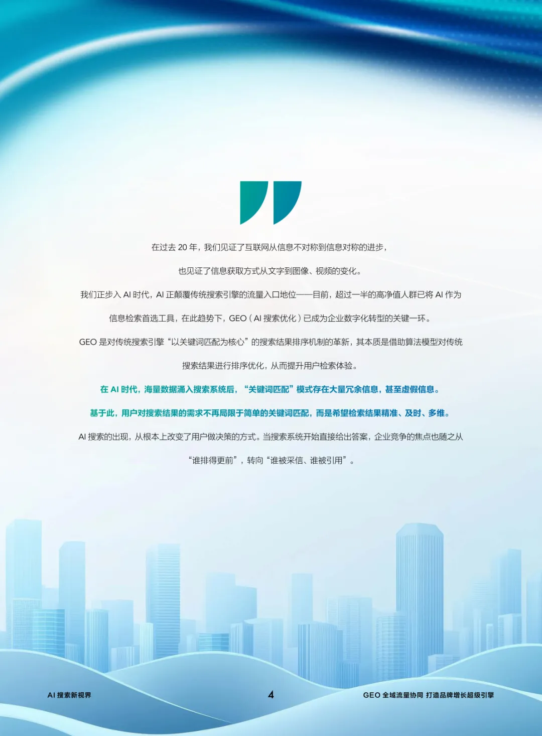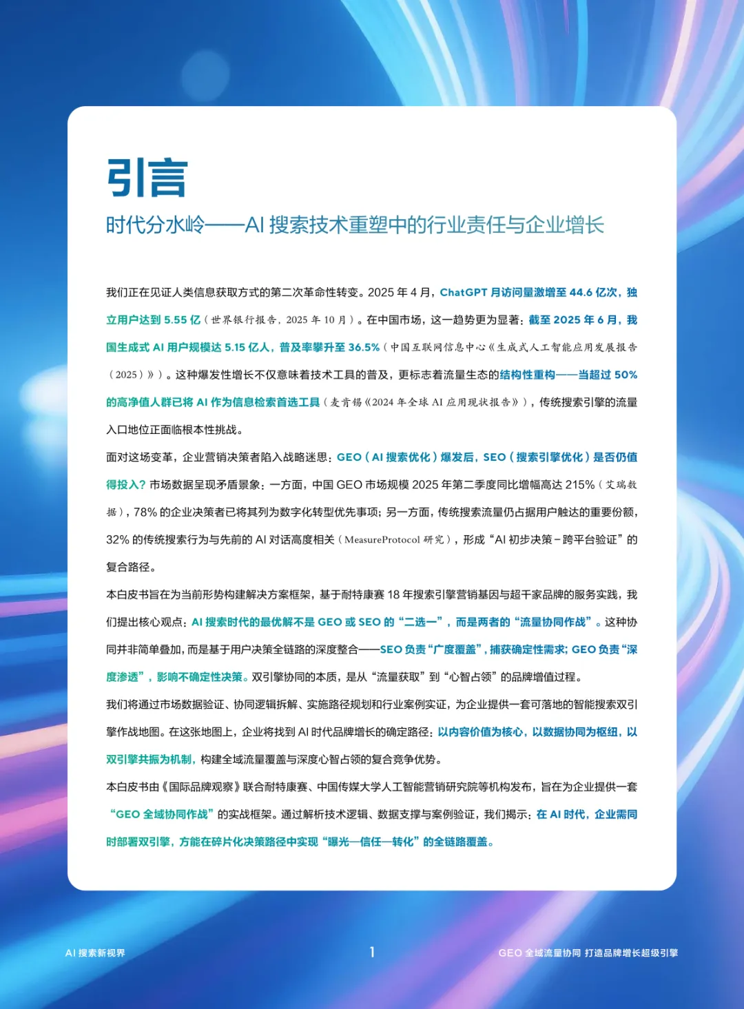 2026年GEO全域流量协同白皮书:AI搜索时代,SEO+GEO双引擎打造品牌增长超级引擎。AI搜索重构流量生态,GEO与SEO协同成为企业数字化转型核心选择,全域流量协同开启品牌增长新范式!