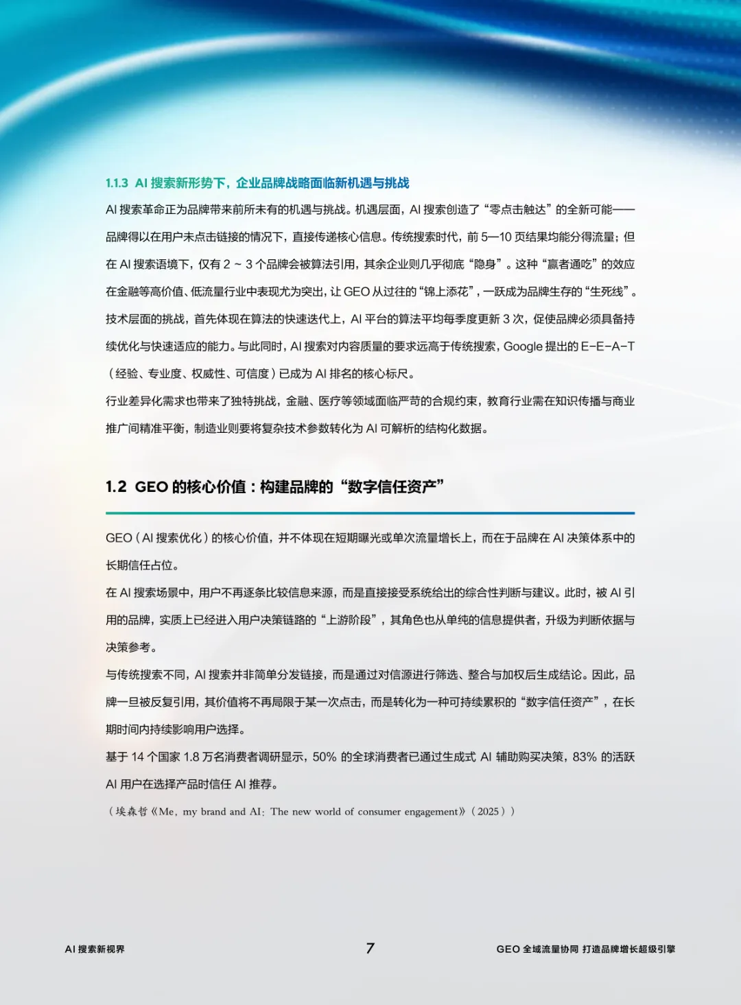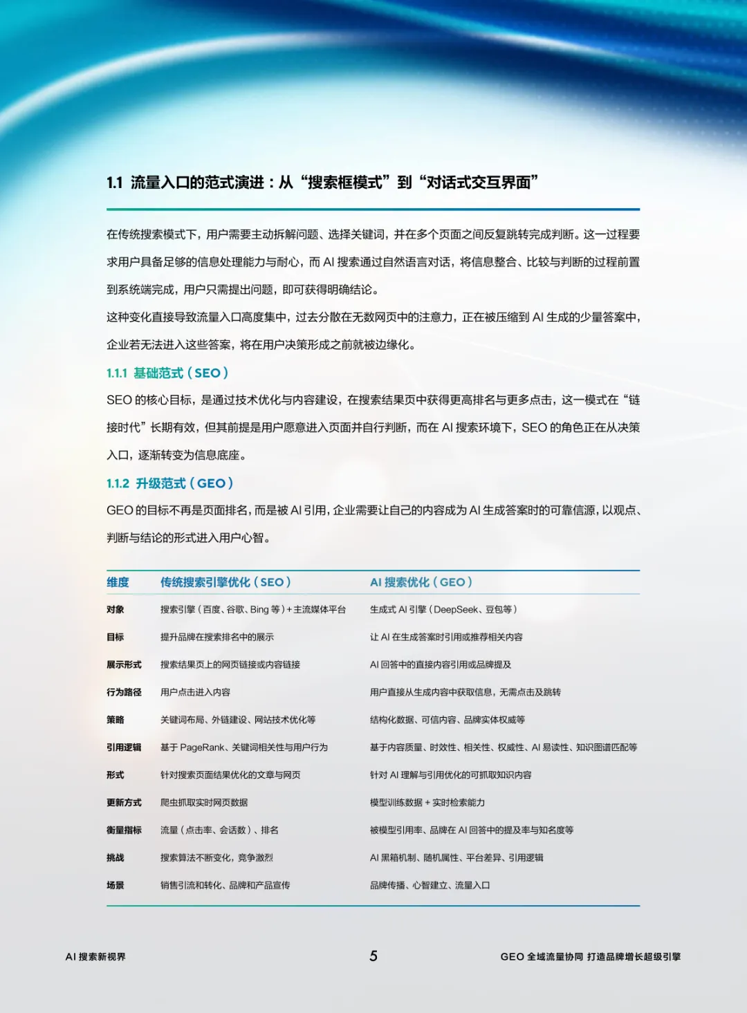 流量入口范式迭代:从SEO的「搜索框模式」转向GEO的「对话式交互界面」,SEO成智能搜索底层基础设施,决定GEO的内容数据基础;GEO聚焦AI答案层,目标是被AI引用而非页面排名。 GEO核心价值是数字信任资产:实现认知入口占领(提前影响用户决策)、权威信任背书(AI引用形成第三方认证)、长期心智沉淀(建立品牌语义关联正反馈),83%活跃AI用户信任AI推荐内容。 SEO是GEO的内容粮仓:SEO捕获70%-92%的长尾高意图流量,其沉淀的结构化、高专业度内容为GEO提供可被AI理解的基础,通过Schema标记、知识图谱等技术进一步提升GEO覆盖效率。 GEO三大结构性优势:重构搜索营销技术底层、锁定高意图流量突破增长瓶颈、建立机器信任与用户心智双重共振,双引擎协同实现42%流量协同率、58%转化闭环率提升。