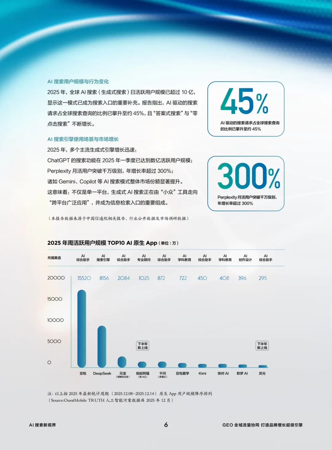 AI搜索重构流量生态:2025年6月我国生成式AI用户达5.15亿,普及率36.5%;超50%高净值人群将AI作为信息检索首选,AI驱动搜索请求占全球搜索查询45%,传统搜索入口地位受挑战。 GEO市场爆发式增长:2025年第二季度中国GEO市场规模同比增幅215%,78%企业将其列为数字化转型优先事项,AI原生App中豆包周活达15520万居首,生成式搜索成流量入口重要补充。 双引擎协同成最优解:32%传统搜索行为与AI对话高度相关,形成复合决策路径;采用SEO+GEO双引擎的企业12个月总流量较单一部署提升25%,AI流量占比达22%,规避单一渠道流量波动。