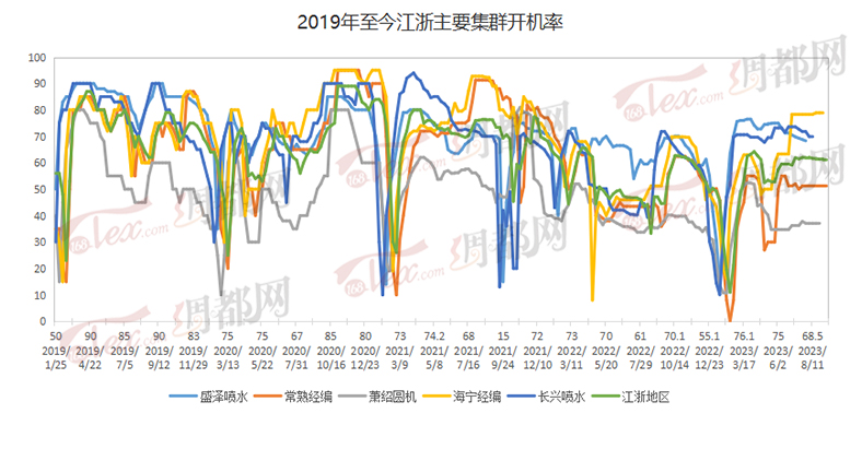 据绸都网数据监测显示,目前盛泽地区的喷水、喷气织机的开机率在69.1%。从图上看上半年织造开工的负荷运行,自春节过后,织造负荷迅速提升,一度攀升至60%-70%之间,随后经历了“金三银四”过后,终端需求逐步下滑,随后织造开工小幅下降,直到进入五月过后,再次出现回调,然实际开工回调幅度有限,仅在60%附近徘徊。织造工厂的负荷要突破8成,还是较为困难。