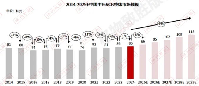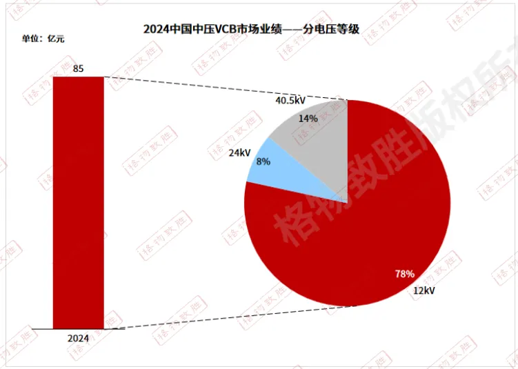 2024年中压VCB整体市场为85亿元,同比增长1%,受到2024年市场经济环境不稳定的影响,市场呈现萎缩态势,不及预期。同时受各厂家降价竞争的影响,VCB销售价格大幅降低,从而导致整体市场规模增速有限。