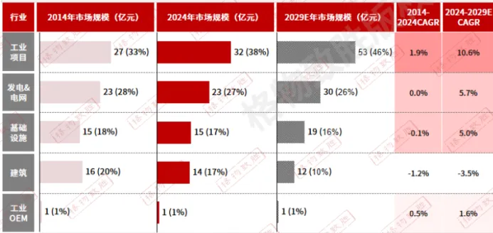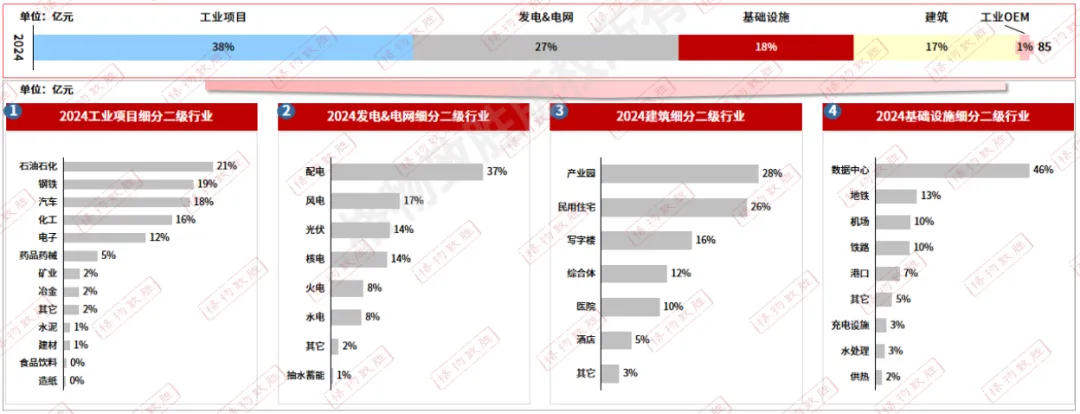 2024年整体市场主要电力电网、石油化工、钢铁等工业行业的支撑。重点外资厂家加强与设计院、盘厂、代理商渠道合作,加大客户关系维护工作以抢项目,在新能源、数据中心、出口市场持续发力,但客户品牌需求下沉,重点企业不断推出中端竞争产品适应市场环境发展;国产品牌依靠发电公司以及电网关系中标大额订单稳定发展。海外市场关注度大幅提升,海外订单量发展迅猛,各重点企业加大海外建厂、海外销售、海外渠道拓展工作,以及通过OEPC配套出口等方式来拉动业绩增长。