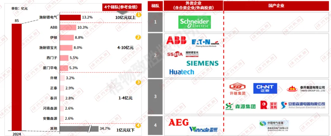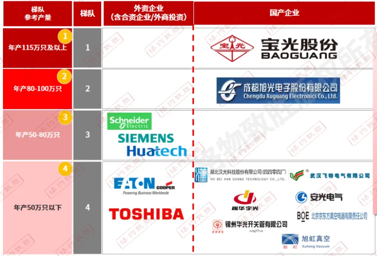 品牌竞争格局:宝光、旭光等国产老牌企业技术成熟,汉光等企业加速追赶;西门子、施耐德等外资品牌技术品质高,在华产量规模大。