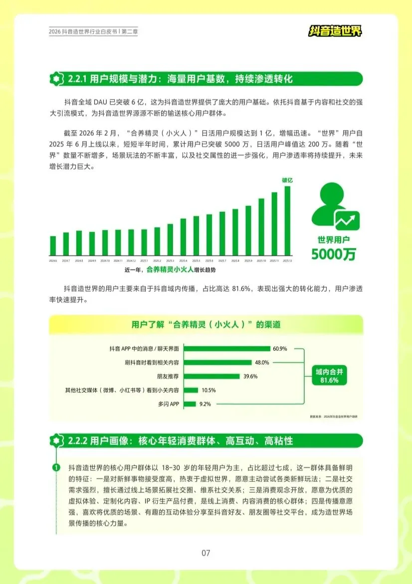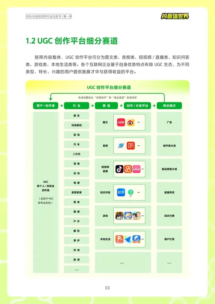 这份《2026抖音造世界行业白皮书》系统地阐述和展示了抖音如何将其庞大的内容与社交生态,升级为一个以UGC(用户生成内容)虚拟创作为核心的、互动社交驱动的元宇宙式平台。它不仅是一份产品介绍,更是一份关于平台战略、生态构建与未来愿景的宣言。以下是对该白皮书的详细解读与分析:一、核心定位:从“内容平台”到“创作生态”的战略升级白皮书清晰地表明,“抖音造世界”并非一个独立的应用,而是抖音全域生态的自然演进和战略补充。其核心目标是推动用户从被动的“内容消费者”转变为主动的“内容创作者”和“世界构建者”,从而将抖音从一个短视频内容平台,拓展为一个集内容、社交、娱乐、创造于一体的综合数字社交场域。这标志着抖音在用户时长和粘性竞争进入深水区后,试图通过提供更深度的互动和创作体验,来开辟新的增长曲线。“抖音造世界”成功构建了一个连接用户、创作者、品牌主的闭环生态,并依靠平台的技术与运营作为基石。 ◦ 规模与潜力:背靠抖音超6亿DAU的流量池,“合养精灵(小火人)”日活已达1亿,“世界”玩法上线半年累计用户破5000万,增长迅猛,且81.6%用户来自抖音域内,转化效率极高。 ◦ 用户画像:核心为18-30岁的年轻群体,其特征是高互动、高粘性、强社交、重消费、爱分享。这构成了生态活跃的基石。 ◦ 核心诉求:用户在此寻求多元情绪价值。“小火人”满足社交链接、创意表达、成就满足;“世界”则提供成就、治愈、探索等体验。这超越了简单娱乐,进入了情感陪伴与自我实现的层面。 ◦ “小火人”创作者(大众层):利用AI生成工具,极大降低门槛,激活全民创意。数千名创作者已设计超5000个形象,兑换超4亿次,头部创作者月收入(火星兑换额)可达数千万,并能实现从0到数百万粉丝的跃迁。 ◦ “世界”创作者(专业层):基于Unity引擎,提供高自由度创作空间,聚焦精品与爆款。已有24个“世界”访问量超百万,榜首《海岛乐园》访问量达4560万。创作类型以农场、观赏、互动类最受欢迎。 ◦ 相关短视频创作者(传播层):围绕“造世界”产出的攻略、教程、体验分享等内容,话题播放量超百亿,为生态破圈和引流提供了巨大动能。 ◦ 玩法创新:提供“品牌定制世界”、“角色/道具植入”、“互动营销活动”三大玩法,实现“场景植入+互动体验+社交传播”的深度融合。 ◦ 价值升级:营销模式从用户“被动接受”广告,升级为在虚拟世界中“主动体验”品牌,实现深度沟通与情感共鸣,并通过用户的社交分享实现裂变。 ◦ 技术赋能:采用“高低融合”策略,为大众提供AI工具降低门槛,为专业者提供Unity引擎释放高自由度创作潜力。 ◦ 活动与政策:通过创作赛、IP联动、火星计划等活动激发热情;并通过分层激励政策(从现金、流量到商业订单)扶持不同阶段的创作者,构建可持续的创作生态。• UGC成功典范:如《一起种地吧》(模拟经营,424万用户)、《猫之岛》(治愈观赏,194万用户),证明了轻度、治愈、社交向内容的强大吸引力。• IP联动范式:与文旅IP(敦煌、故宫)合作,在虚拟世界还原场景,实现文化传播与用户互动;与游戏IP(和平精英、逆水寒)联动,实现形象与玩法的双向赋能。这为IP的价值延伸开辟了新路径。白皮书最后描绘了“抖音造世界”的未来图景,也是其战略野心的体现:1. 体验升级:从“刷”到“玩”:推动抖音成为提供“共同记忆”和“群体归属感”的综合社交场域,并可能成为用户进入未来“镜像世界”(数字孪生世界)的重要入口。2. 生产革命:AI赋能“一人公司”(OPC):AI工具将持续降低创作门槛,激发全民创作。同时,AI与大模型的发展使得单一个体(One Person Company) 能够以更低成本实现复杂创意,预示着一个“个人创意产能”大爆发的时代。3. 商业演进:从“用户付费”到“内容消费”:依托抖音成熟的巨量引擎商业化生态(千川、星图等),“造世界”中的虚拟创作可无缝对接广告、营销、变现链路。同时,该平台为原生虚拟IP的孵化提供了全新土壤,开辟了超越传统内容形式的IP创造新赛道。这份白皮书揭示,“抖音造世界”的本质是抖音在新时代的核心生态战略。它通过提供低门槛的创作工具、成熟的流量与商业化闭环以及强社交互动场景,成功地将平台的海量用户转化为创作者,将内容消费转化为互动体验与价值创造。其核心逻辑是:以“互动社交”为灵魂,以“UGC创作”为引擎,以“AI技术”为杠杆,最终构建一个连接虚拟与现实、融合消费与创造、容纳个人表达与商业繁荣的新型数字生活空间。 这不仅是抖音对自身边界的一次重大突破,也是对下一代互联网人机交互和社交模式的深刻探索。部分内容预览