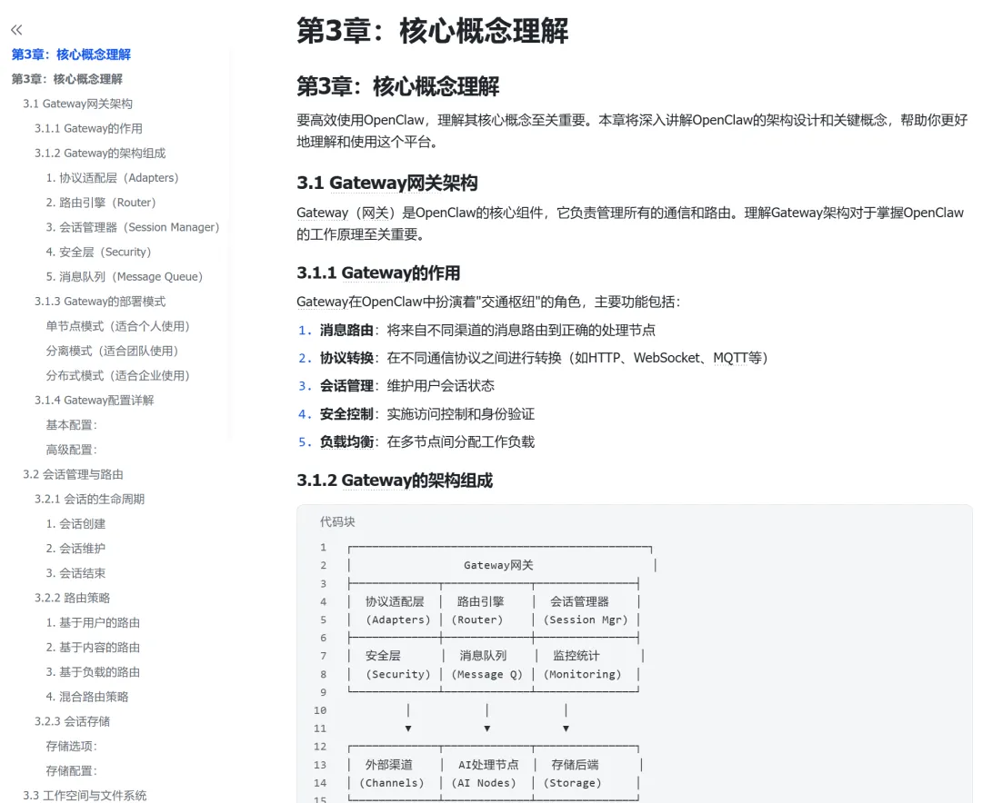 第1章:OpenClaw简介第2章:部署方式详解第3章:核心概念理解第4章:命令行工具使用日第5章:Skills系统详解第6章:文件与工作空间管理第7章:国内应用集成指南第8章:自动化与定时任务第9章:多模型集成第10章:安全与权限管理日第11章:个人效率提升实战日第12章:公众号&小红书创作自动化实战三第13章:企业应用实战第14章:开发与集成实战第15章:高级配置与优化第16章:故障排除与调试第17章:社区贡献与生态