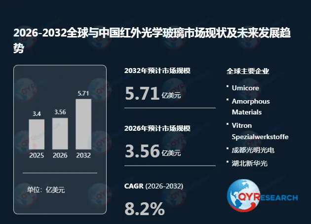 根据QYR(恒州博智)的统计及预测,2025年全球红外光学玻璃市场销售额达到了3.40亿美元,预计2032年将达到5.71亿美元,年复合增长率(CAGR)为8.2%(2026-2032)。