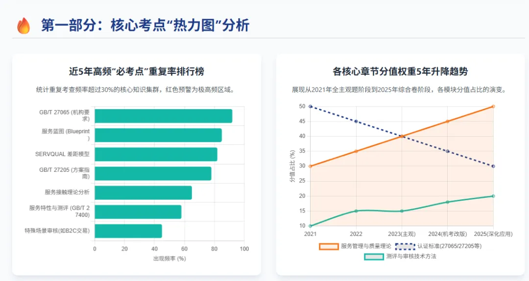 伴随中国认证认可协会(CCAA)对审核员注册准则及考试大纲的持续深化改革,服务认证作为现代国家质量基础设施(NQI)体系的核心支柱之一,其专业化、标准化与实操化特征在历年资格考试中得到了前所未有的深刻体现。纵观2021年至2025年的《服务认证基础》历年真题,以及全新发布的《服务认证基础考试大纲(第2版)》(文件编号:CCAA-TR-104-02:2025),该科目的考核逻辑已经发生了一场深刻的范式转移1。早期的考试相对侧重于对基础理论和规范文本的机械式记忆,而当前的考核则全面转向了对审查实践情境化应用能力的深度勘测2。为了精准把握这一历史性的命题变迁,本白皮书依托对过去五年海量真题样本的自然语言处理、考点标签化提取与底层逻辑解构,系统性地生成了核心考点热力图,深度剖析了命题风格与设障套路的演变轨迹,并创造性地构建了高阶备考模型。本报告的最终目的,是为服务认证领域的专业化人才选拔、认证机构的能力建设以及广大从业者的理论深化,提供具备前瞻性、系统性与实战指导价值的学术洞察。一、核心考点热力图分析与知识体系深度解构