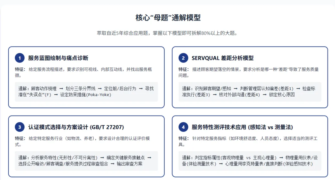 服务与服务管理 | 服务的无形性/异质性、服务接触理论、服务蓝图、削峰填谷技术、排队论 | 极高 | 从“识别蓝图四条线”转向应用可视线划分前后台,并精准匹配对应的《服务规范》与《管理规范》;考查削峰填谷对满意度的驱动 1。 | 掌握1 |