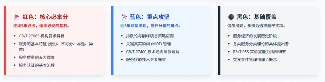 为了将上述六大模型与浩如烟海的大纲考点进行高效衔接,结合《服务认证基础考试大纲(第2版)》中对知识点明确的“掌握”、“熟悉”、“了解”三级划分1,本白皮书强烈建议考生采用“三色笔记”能级管理策略,实现精力的非对称投入2:●红色能级(绝对核心禁区,分值占比>40%):严格对应新大纲中的“掌握”级知识点。涵盖合格评定功能法的深层机理、服务及认证核心术语(如信度、效度、产消者的精确定义)、GB/T 27400及GB/T 27207等五大核心国家标准、5GAP模型、服务蓝图技术,以及《民法典》合同编、《电子商务法》等硬核法规。对于红色区域的知识,不仅要求全文背诵,更要求达到“肌肉记忆”与“条件反射”的级别,确保在高度伪装的复杂情境题中实现零失误打击1。●蓝色能级(重点攻坚地带,分值占比约35%):对应大纲中的“熟悉”级知识点。包括服务的分类标准体系、排队论的各种应用变体、削峰填谷技术的实施路径、认证业务范围的科学界定等。此类知识具有极高的区分度,是拉开分差的关键。备考策略应侧重于“深度理解”与“场景延伸”,通过大量的模拟情境案例,深刻把握概念的应用边界,从而精准排除多选题中的高级干扰项1。●黑色能级(基础覆盖外围,分值占比约25%):对应大纲中的“了解”级知识点。包括NQI的宏观协同效应原理、《中国人民银行法》、《著作权法》等偏远背景知识或非核心行政规章。备考策略采取“保持眼熟”的高效泛读模式。在考场上,只需具备宏观视野,能够利用常识和逻辑排除法进行规避即可,绝对避免在黑色区域过度深钻而耗费宝贵的时间成本1。四、2026年及未来命题趋势全景深度预测