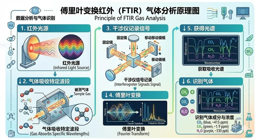 基本流程:红外光源→气体吸收特定波段→干涉仪记录信号→傅里叶变换→获得光谱→识别气体