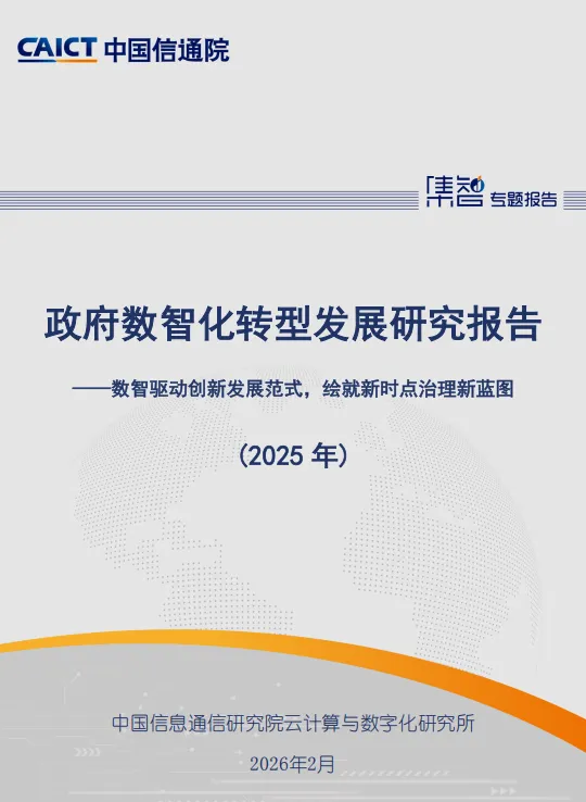 《政府数智化转型发展研究报告(2025年)》由中国信息通信研究院云计算与数字化研究所编制,于2026年2月发布,是一份系统梳理全球与中国政府数智化转型进程、特征、格局及未来发展路径的深度专题报告。报告以“数智驱动创新发展范式,绘就新时点治理新蓝图”为主题,旨在为政产学研各界提供参考,推动整体型、服务型政府建设,助力中国式现代化。