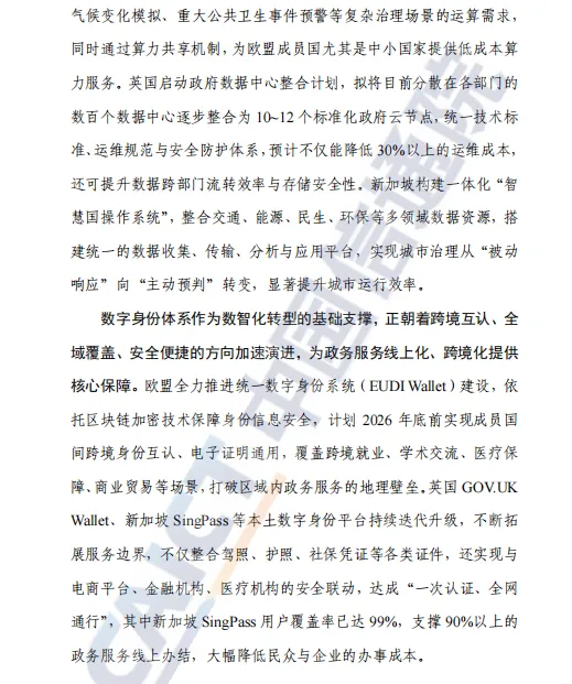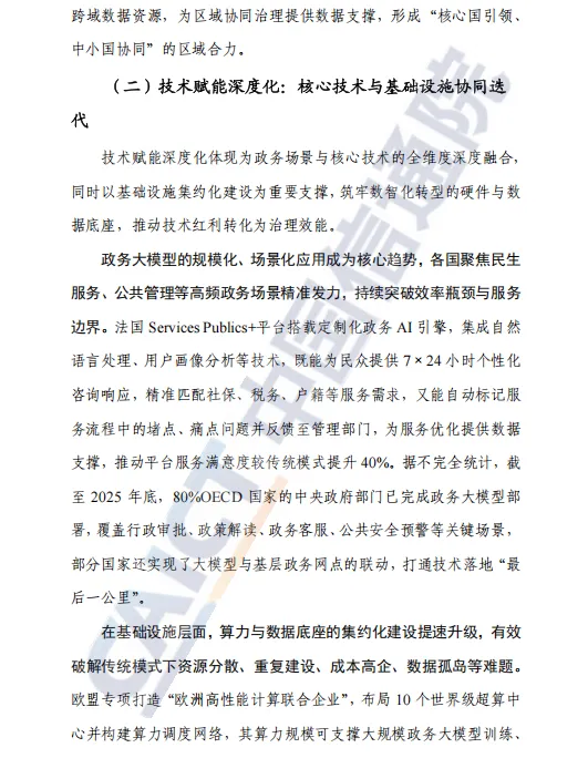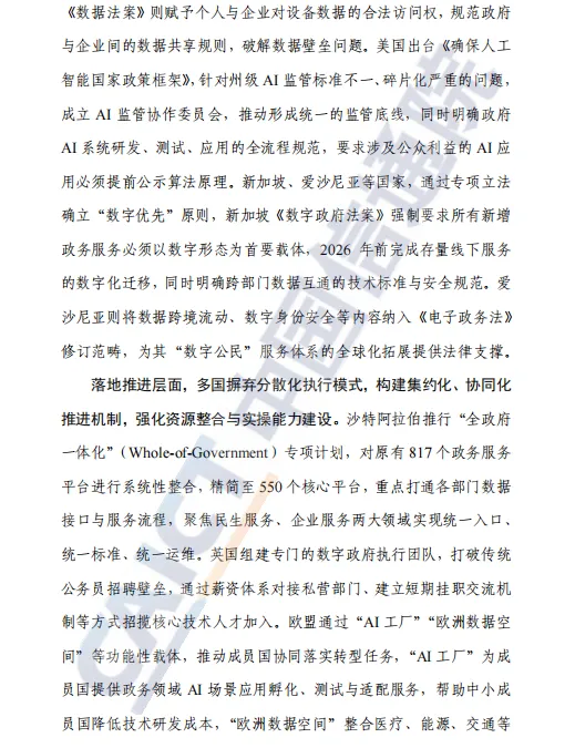 报告首先分析了全球政府数智化转型的三大时代特征:战略引领系统化,表现为各国将数智化上升为国家核心战略,形成“顶层规划—法规保障—落地推进”全链条闭环;技术赋能深度化,体现在政务大模型规模化应用、算力与数据底座集约化建设、数字身份体系跨境互认等方面;治理体系协同化,强调多元主体参与和风险防控动态平衡,通过跨区域、跨领域协同提升治理效能。