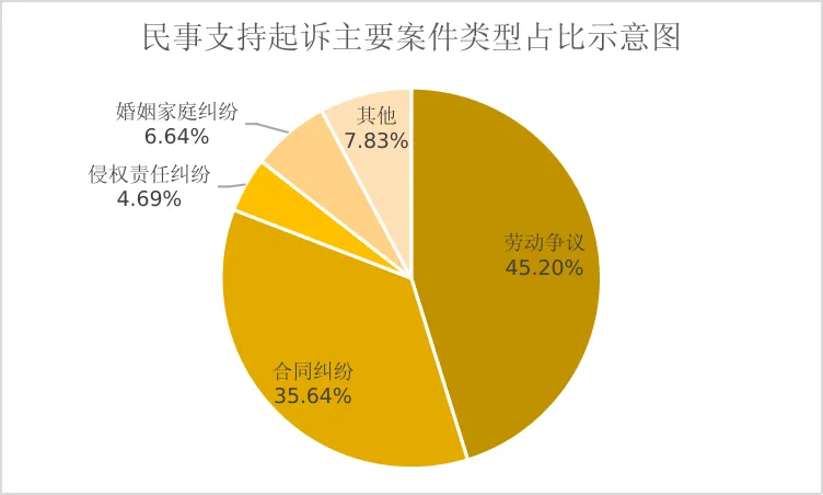 2025年,全国检察机关共受理支持起诉案件60852件,同比下降26.2%。其中,农民工讨薪类案件下降32%。检察机关坚持“支持”定位,严格把握支持起诉适用条件,把检察资源用在诉讼能力弱等真正需要支持的特定群体权益维护上,持续规范开展支持起诉工作。从案件类型看,数量较多的有:劳动争议27508件、合同纠纷21688件、婚姻家庭纠纷4040件、侵权责任纠纷2852件,合占92.2%。经审查,共支持起诉42062件,从支持对象看,支持农民工起诉维权案件27502件,占65.4%;支持妇女起诉维权10743件、支持未成年人起诉维权3569件、支持老年人起诉维权1434件、支持残疾人起诉维权395件。特殊群体权益保障力度不断加大。