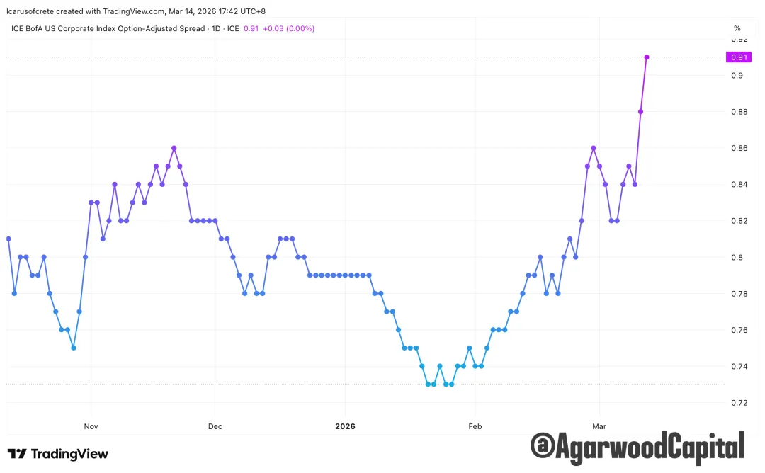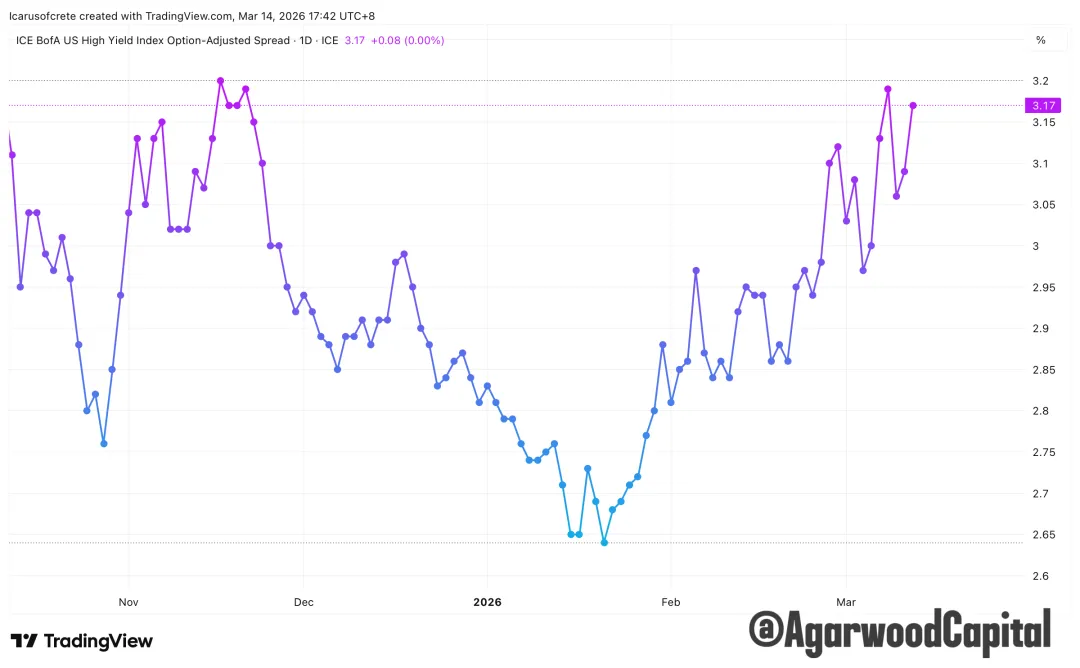 美股面臨的另一個壓力是私募信貸市場的風險,目前已導致信用利差快速走高。
