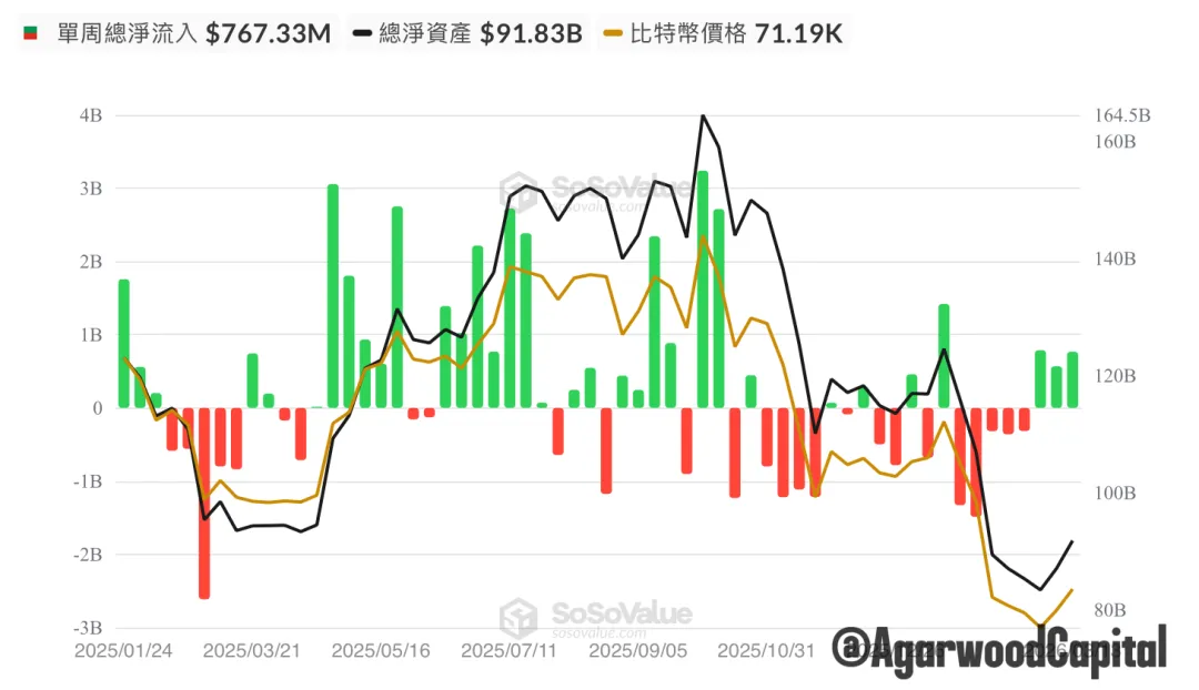 本週BTC價格再次表現出對納指的相對強勢,主要受益於財庫的機構性買盤和現貨ETF連續三周的淨流入。