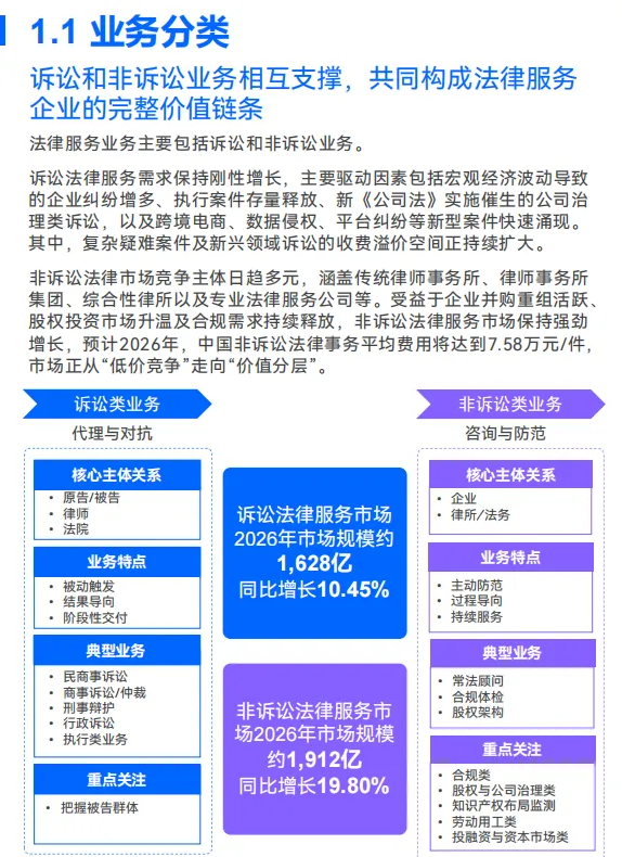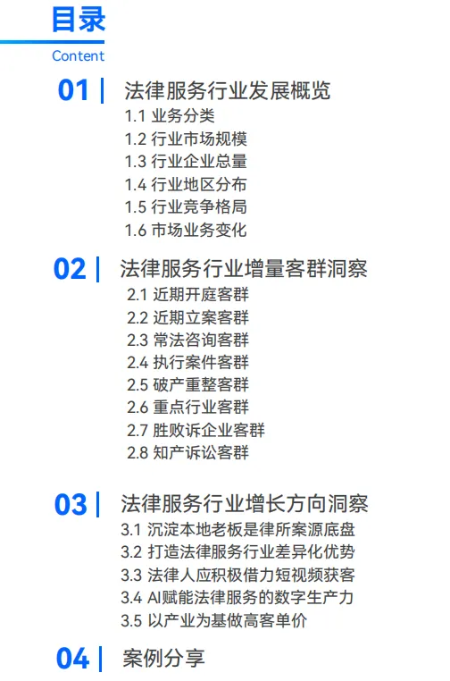 三大高增长领域:直播电商(主播纠纷、广告合规)、企业出海(跨境合规、涉外争议)、强制执行(存量案件超 1200 万件,市场规模预计破万亿)。 细分客群机会:涉诉初创企业、建筑 / 制造 / 批发行业常法咨询客户、破产重整企业(制造业占比最高,同比增长 31.77%)。