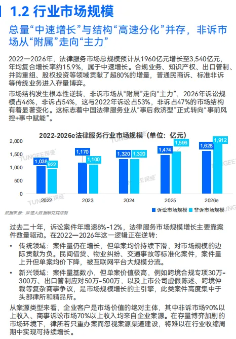 规模稳步增长:2026 年市场规模预计达 3540 亿元,年复合增速 15.9%,非诉业务(1912 亿元)首次超越诉讼业务(1628 亿元),标志行业从 “事后救济” 转向 “事前风控”。 竞争加剧:全国法律服务企业超 21 万家,律师人数预计达 90 万,头部律所集中度提升,中小律所陷入 “案源内卷”,人均创收差距持续拉大。 区域集中:广东、山东、江苏为企业数量前三省份,长三角律师总数超 18.55 万,头部律所人均创收突破 100 万元。