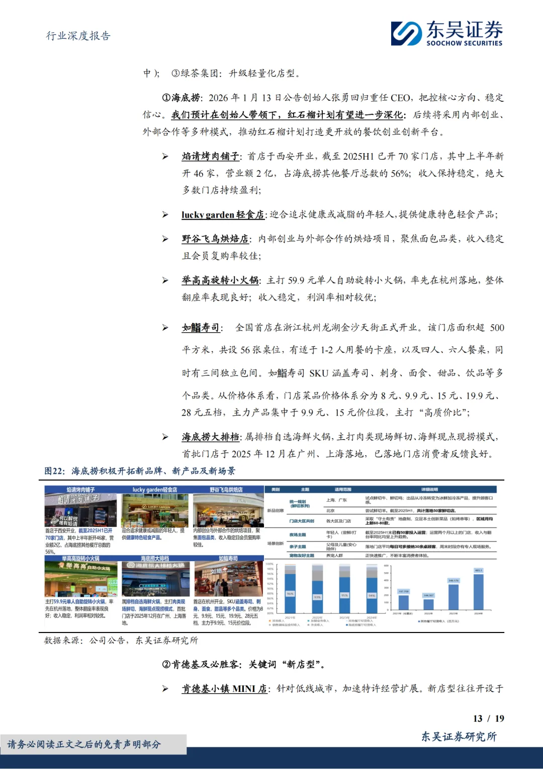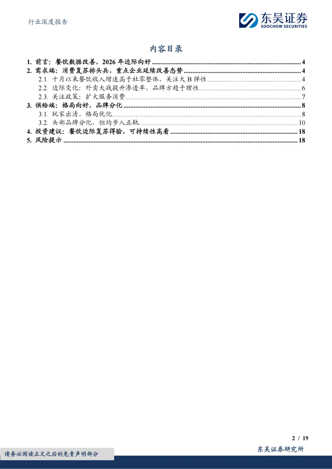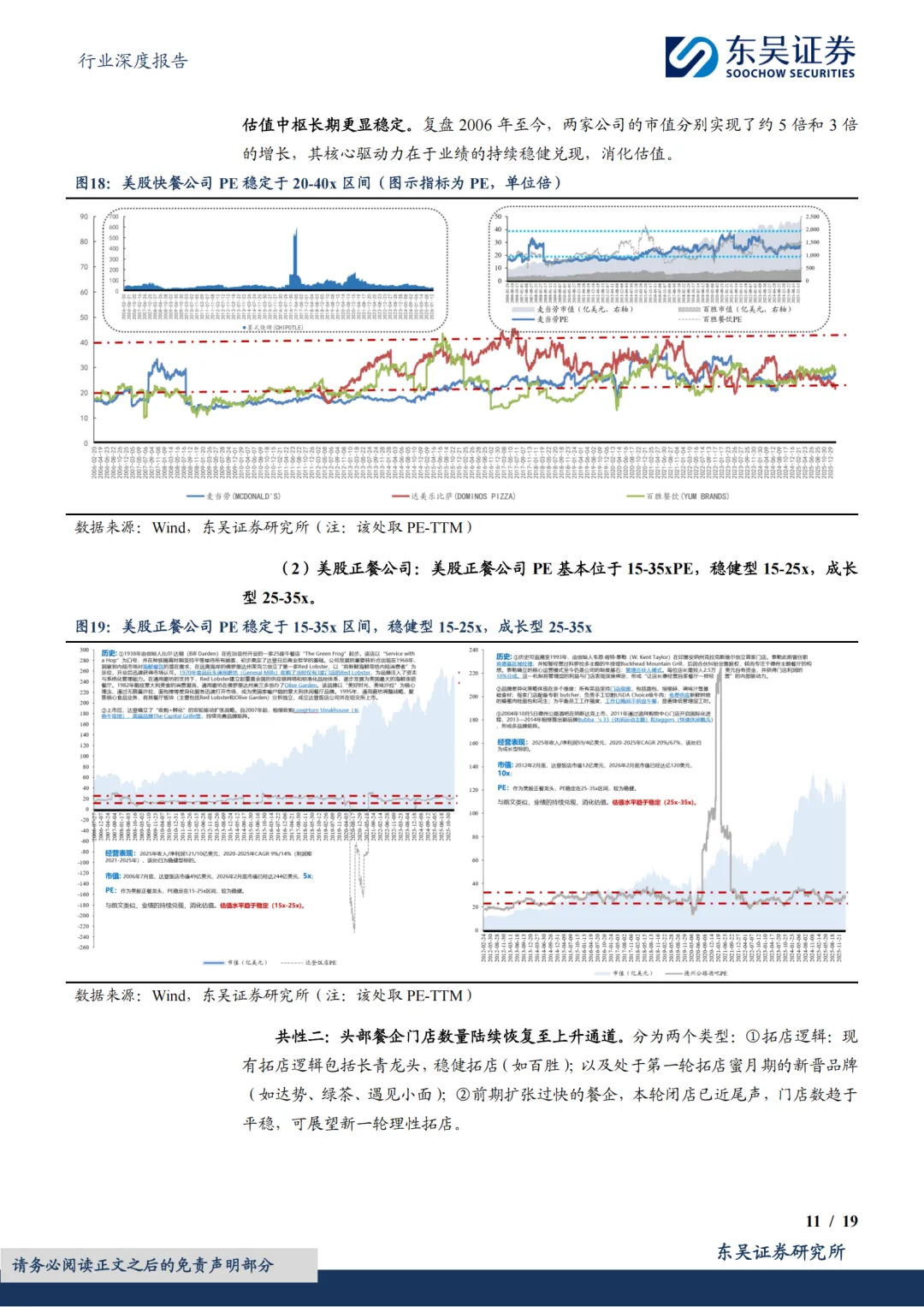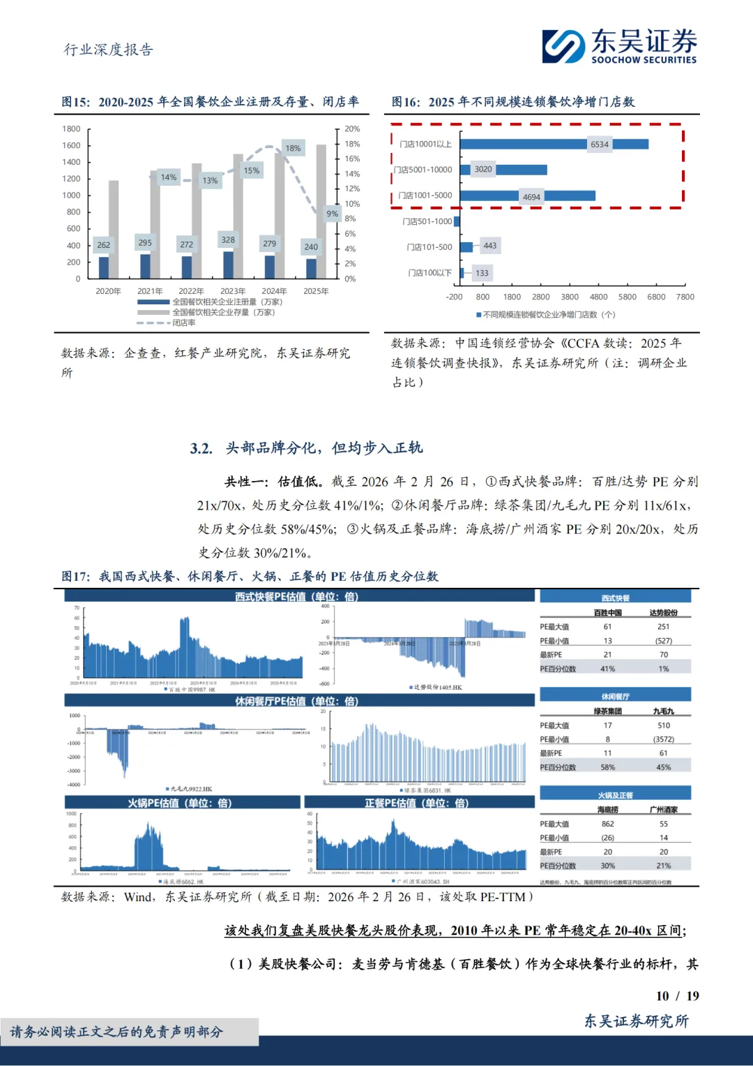 头部品牌分化,但均步入正轨:①共性一:估值低。截至2026年2月26日,西式快餐品牌百胜/达势PE分别21x/70x,处历史分位数41%/1%;休闲餐厅品牌绿茶集团/九毛九PE分别11x/61x,处历史分位数58%/45%;火锅及正餐品牌海底捞/广州酒家PE分别20x/20x,处历史分位数30%/21%。复盘美股股价表现,2010年以来快餐龙头PE常年稳定在20-40x区间,百胜及麦当劳2006年至今市值分别实现了约5倍和3倍的增长,其业绩的持续稳健兑现有效消化估值。②共性二:头部餐企门店数量陆续恢复至上升通道。一为拓店逻辑,包括长青龙头,稳健拓店(如百胜);以及处于第一轮拓店蜜月期的新晋品牌(如达势、绿茶、遇见小面);二为前期扩张过快的餐企,本轮闭店已近尾声,门店数趋于平稳,可展望新一轮理性拓店。③共性三:经营数据转好,多数连锁餐饮门店同店表现(或者TC)逐步转好;客单价亦有企稳态势。④共性四:积极寻找第二成长曲线,新品牌/新店型可圈可点。新品牌代表海底捞,开设焰请烤肉铺子、举高高(单人自助旋转小火锅)、如鮨寿司等;新店型代表如百胜中国、九毛九、绿茶集团。⑤共性五:成本结构性优化,主要优化项在于租金成本。⑥共性六:AI数字化、供应链提效。