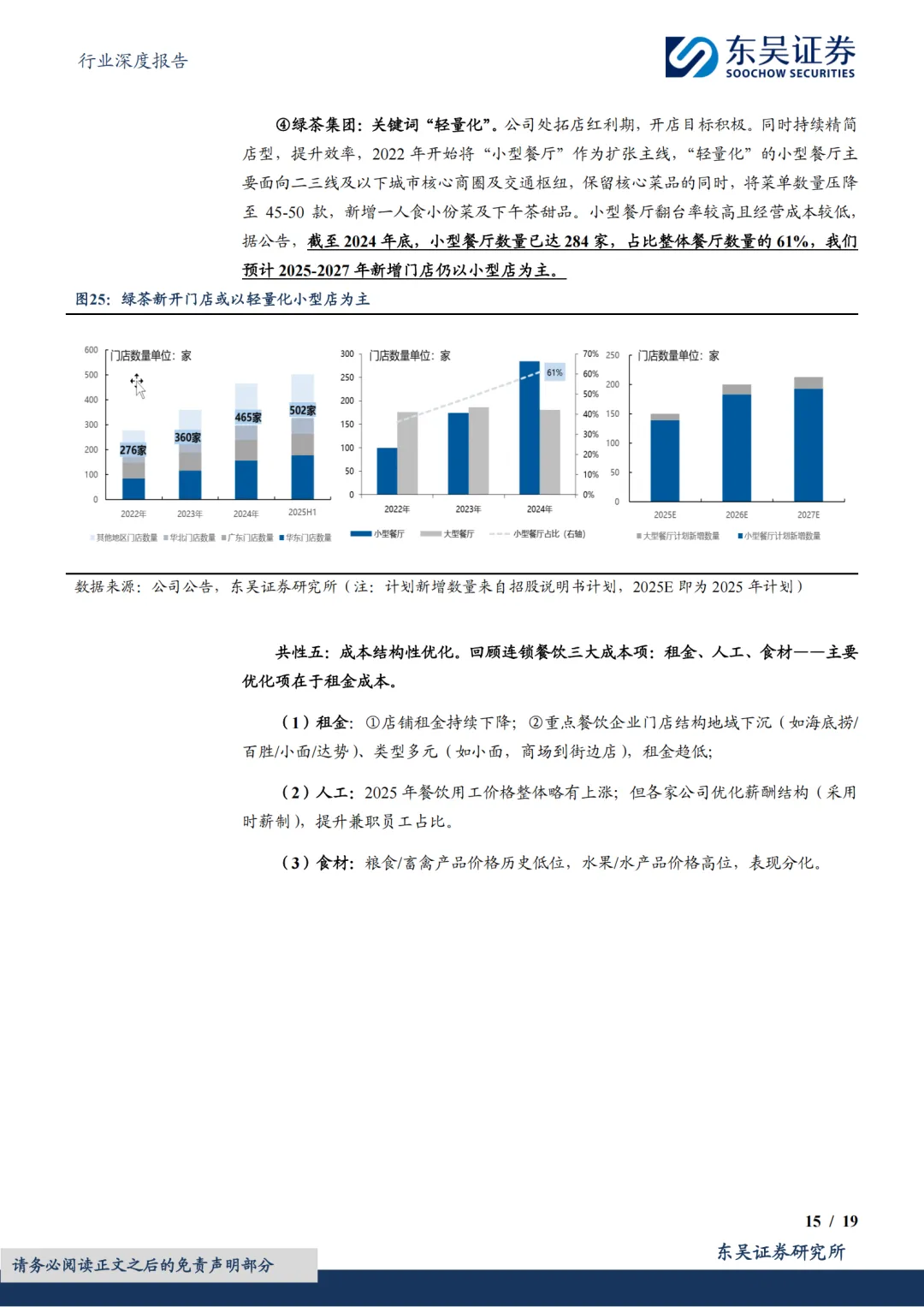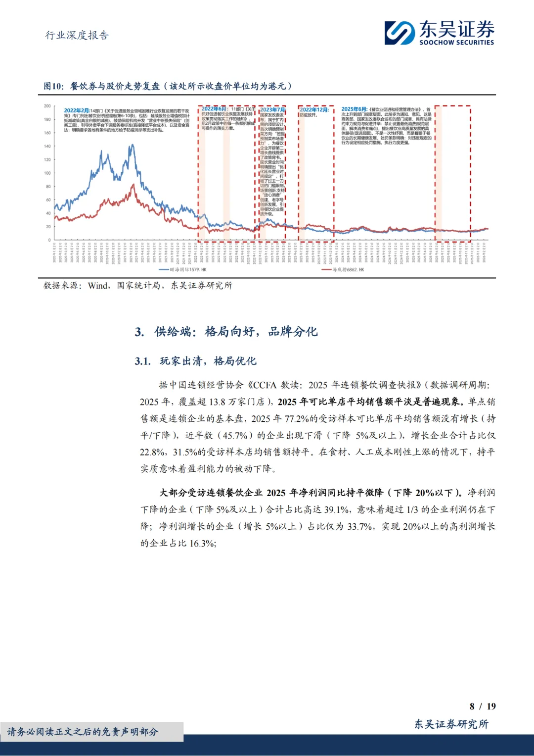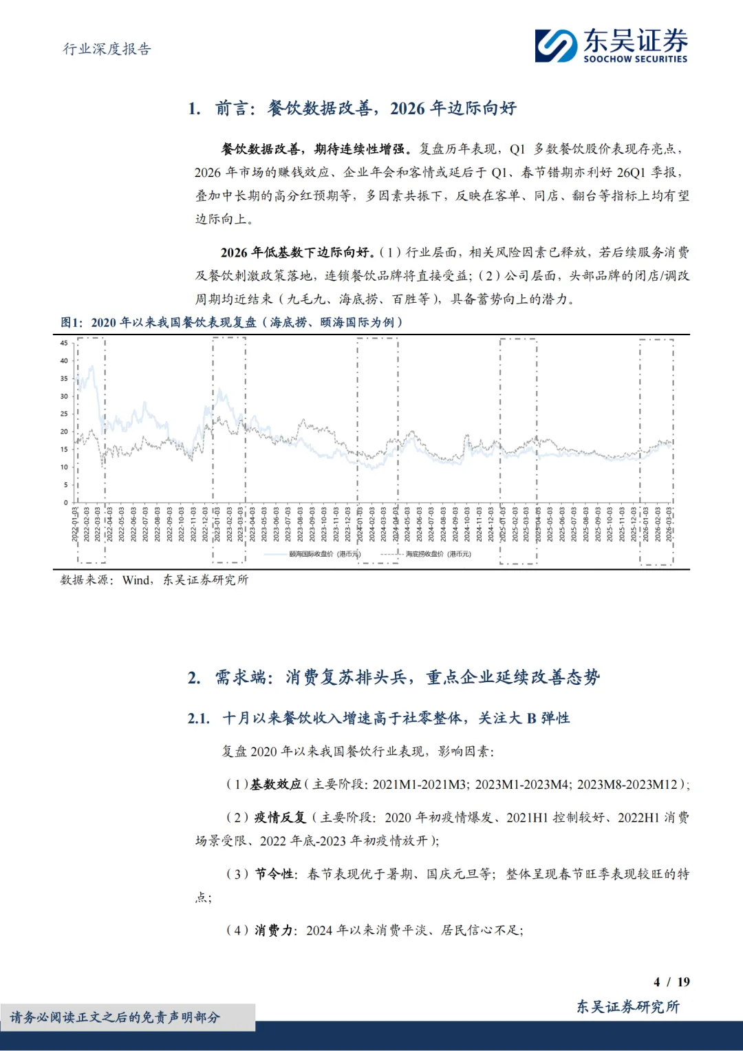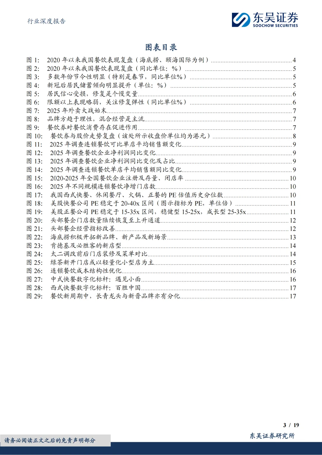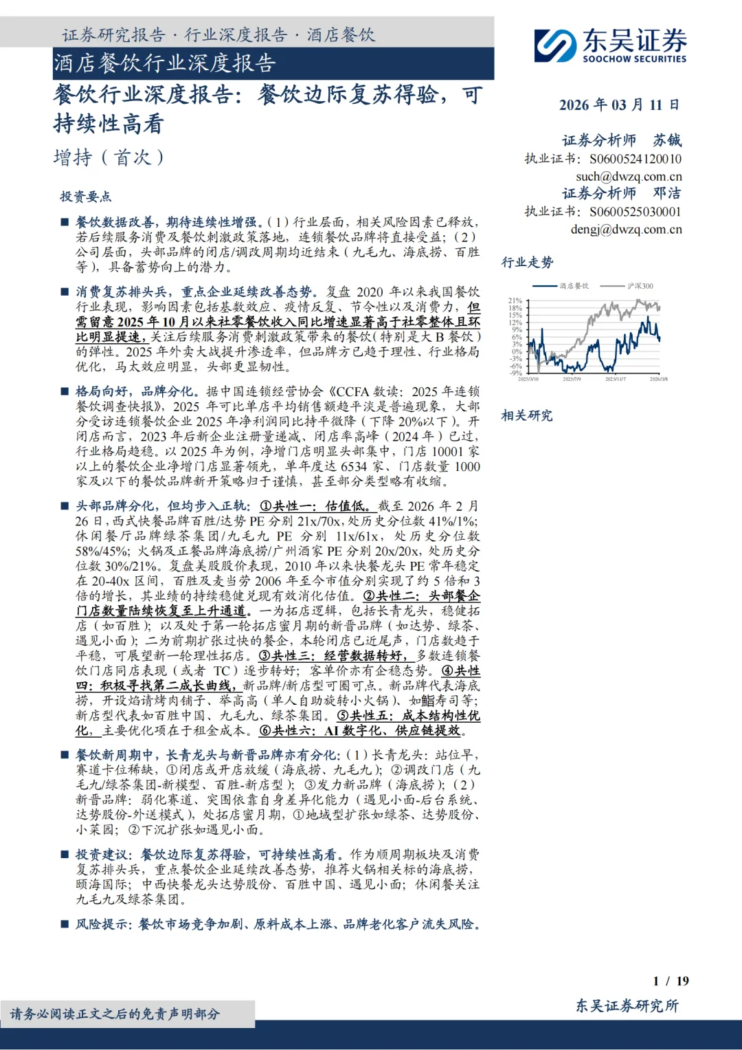 头部品牌分化,但均步入正轨:①共性一:估值低。截至2026年2月26日,西式快餐品牌百胜/达势PE分别21x/70x,处历史分位数41%/1%;休闲餐厅品牌绿茶集团/九毛九PE分别11x/61x,处历史分位数58%/45%;火锅及正餐品牌海底捞/广州酒家PE分别20x/20x,处历史分位数30%/21%。复盘美股股价表现,2010年以来快餐龙头PE常年稳定在20-40x区间,百胜及麦当劳2006年至今市值分别实现了约5倍和3倍的增长,其业绩的持续稳健兑现有效消化估值。②共性二:头部餐企门店数量陆续恢复至上升通道。一为拓店逻辑,包括长青龙头,稳健拓店(如百胜);以及处于第一轮拓店蜜月期的新晋品牌(如达势、绿茶、遇见小面);二为前期扩张过快的餐企,本轮闭店已近尾声,门店数趋于平稳,可展望新一轮理性拓店。③共性三:经营数据转好,多数连锁餐饮门店同店表现(或者TC)逐步转好;客单价亦有企稳态势。④共性四:积极寻找第二成长曲线,新品牌/新店型可圈可点。新品牌代表海底捞,开设焰请烤肉铺子、举高高(单人自助旋转小火锅)、如鮨寿司等;新店型代表如百胜中国、九毛九、绿茶集团。⑤共性五:成本结构性优化,主要优化项在于租金成本。⑥共性六:AI数字化、供应链提效。