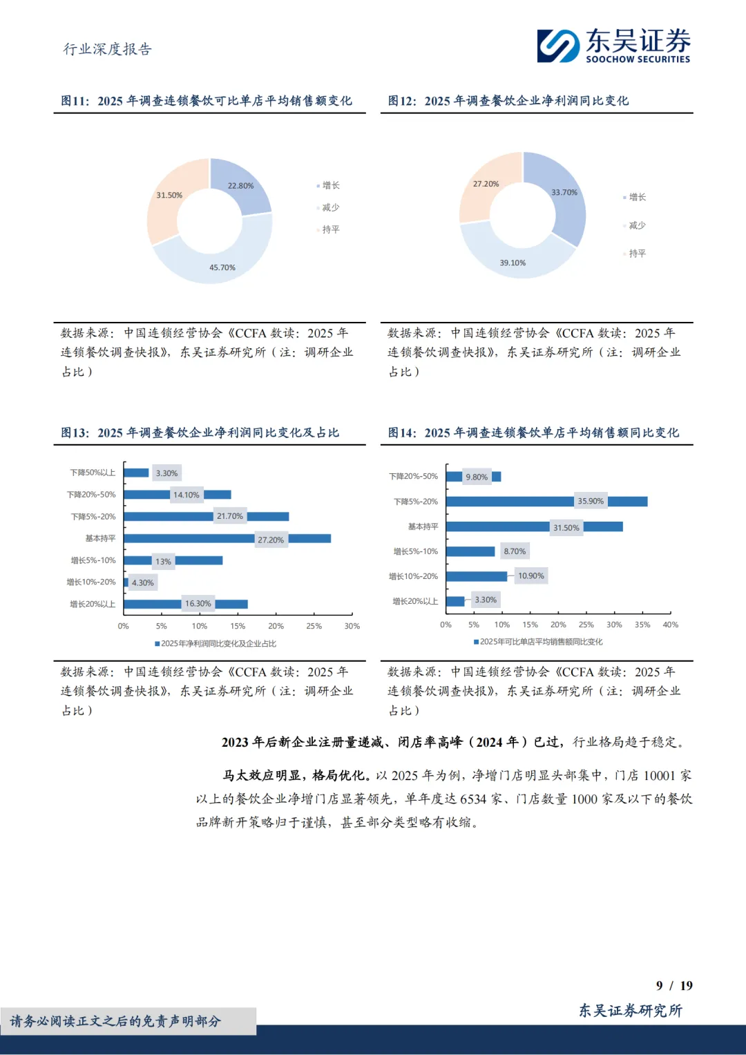 格局向好,品牌分化。据中国连锁经营协会《CCFA数读:2025年连锁餐饮调查快报》,2025年可比单店平均销售额趋平淡是普遍现象,大部分受访连锁餐饮企业2025年净利润同比持平微降(下降20%以下)。开闭店而言,2023年后新企业注册量递减、闭店率高峰(2024年)已过,行业格局趋稳。以2025年为例,净增门店明显头部集中,门店10001家以上的餐饮企业净增门店显著领先,单年度达6534家、门店数量1000家及以下的餐饮品牌新开策略归于谨慎,甚至部分类型略有收缩。