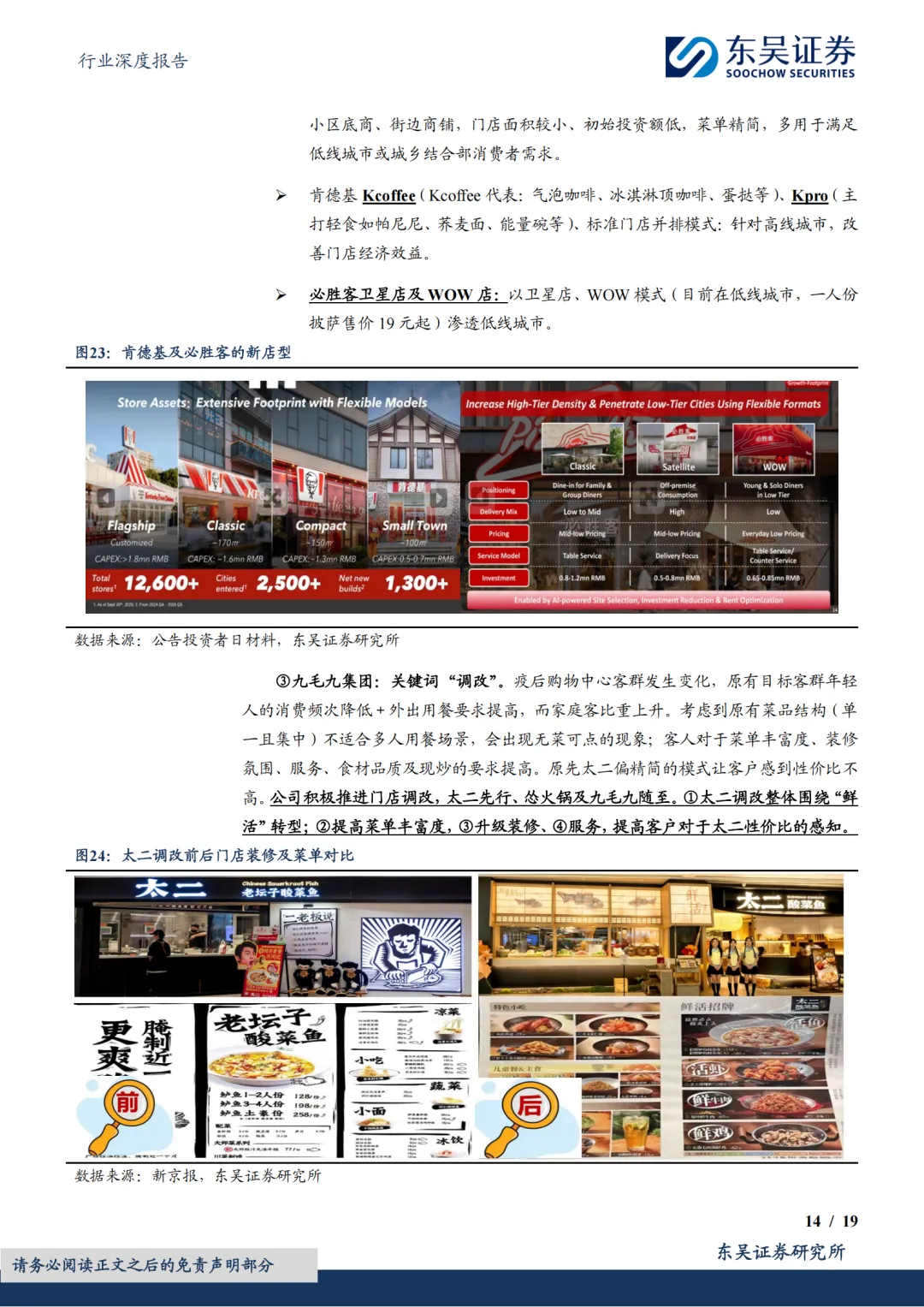餐饮新周期中,长青龙头与新晋品牌亦有分化:(1)长青龙头:站位早,赛道卡位稀缺,①闭店或开店放缓(海底捞、九毛九);②调改门店(九毛九/绿茶集团-新模型、百胜-新店型);③发力新品牌(海底捞);(2)新晋品牌:弱化赛道、突围依靠自身差异化能力(遇见小面-后台系统、达势股份-外送模式),处拓店蜜月期,①地域型扩张如绿茶、达势股份、小菜园;②下沉扩张如遇见小面。