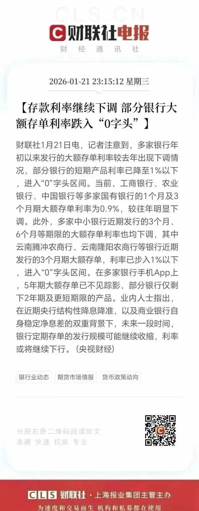 2026 年初央行下调了再贷款利率,释放的信号很明确,市场的钱会更宽松。跟着而来的就是存款利率一跌再跌,国有大行三个月的大额存单,利率都跌破1%了,妥妥进入零利率时代。