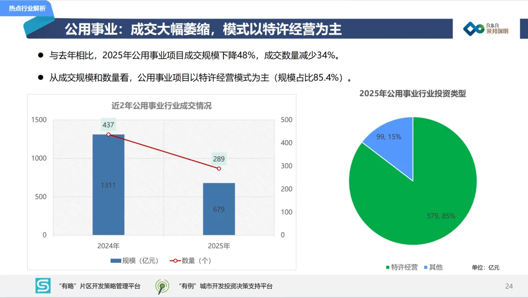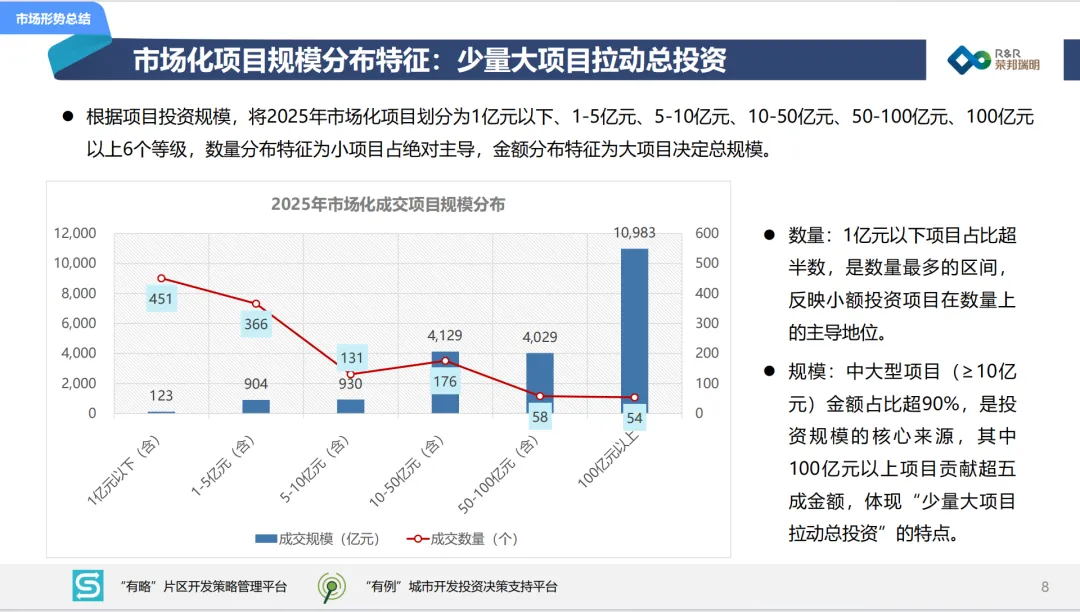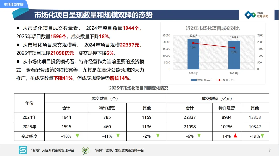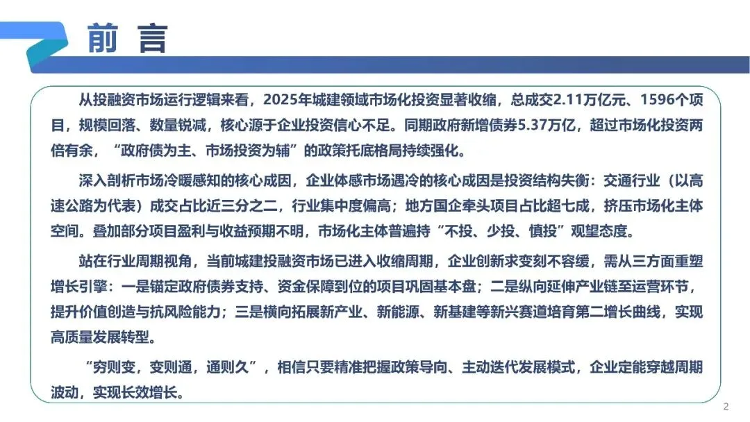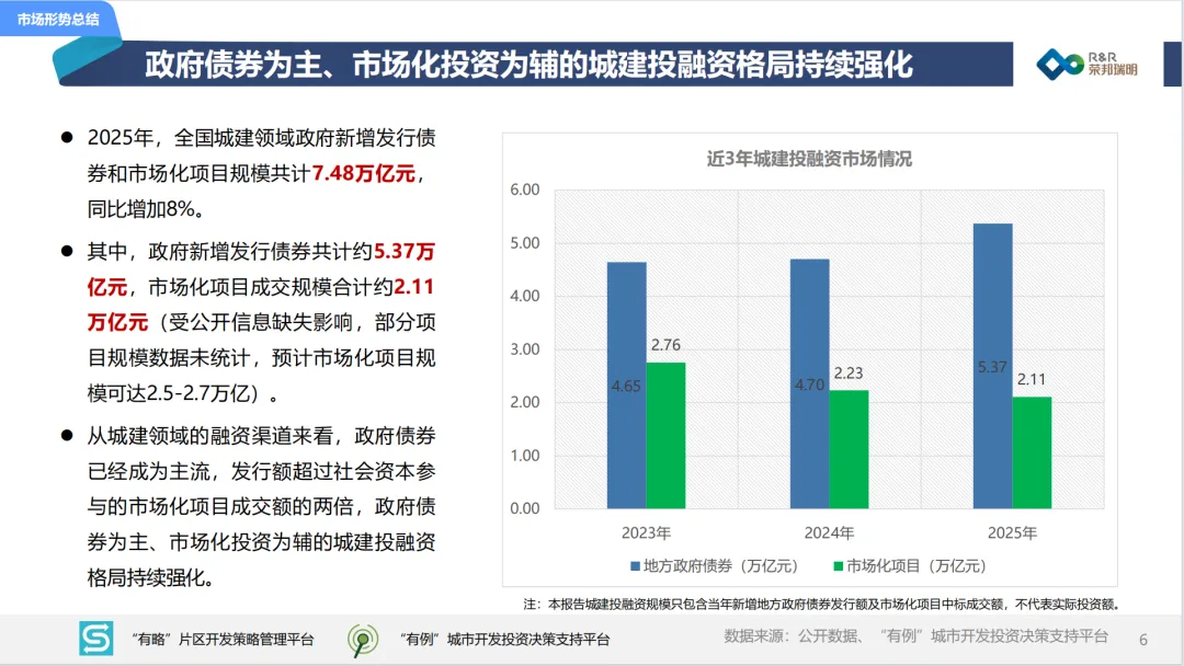 从投融资市场运行逻辑来看,2025年城建领域市场化投资显著收缩,总成交2.11万亿元、1596个项目,规模回落、数量锐减,核心源于企业投资信心不足。同期政府新增债券5.37万亿,超过市场化投资两倍有余,“政府债为主、市场投资为辅”的政策托底格局持续强化。