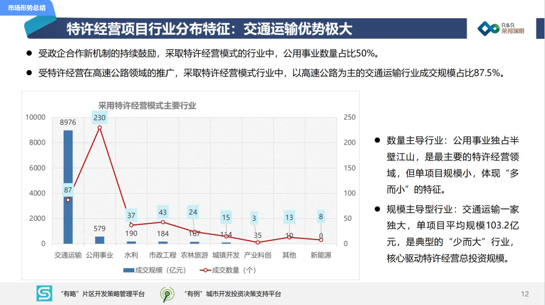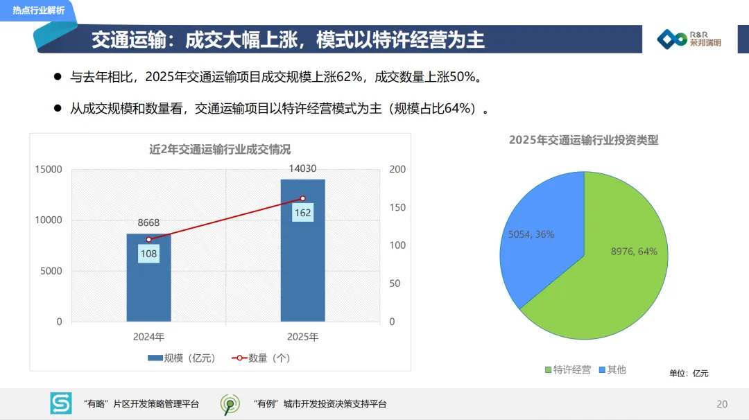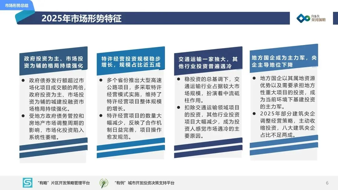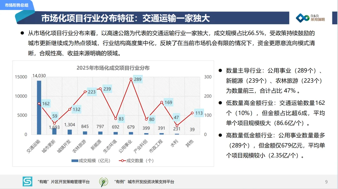 深入剖析市场冷暖感知的核心成因,企业体感市场遇冷的核心成因是投资结构失衡:交通行业(以高速公路为代表)成交占比近三分之二,行业集中度偏高;地方国企牵头项目占比超七成,挤压市场化主体空间。叠加部分项目盈利与收益预期不明,市场化主体普遍持“不投、少投、慎投”观望态度。