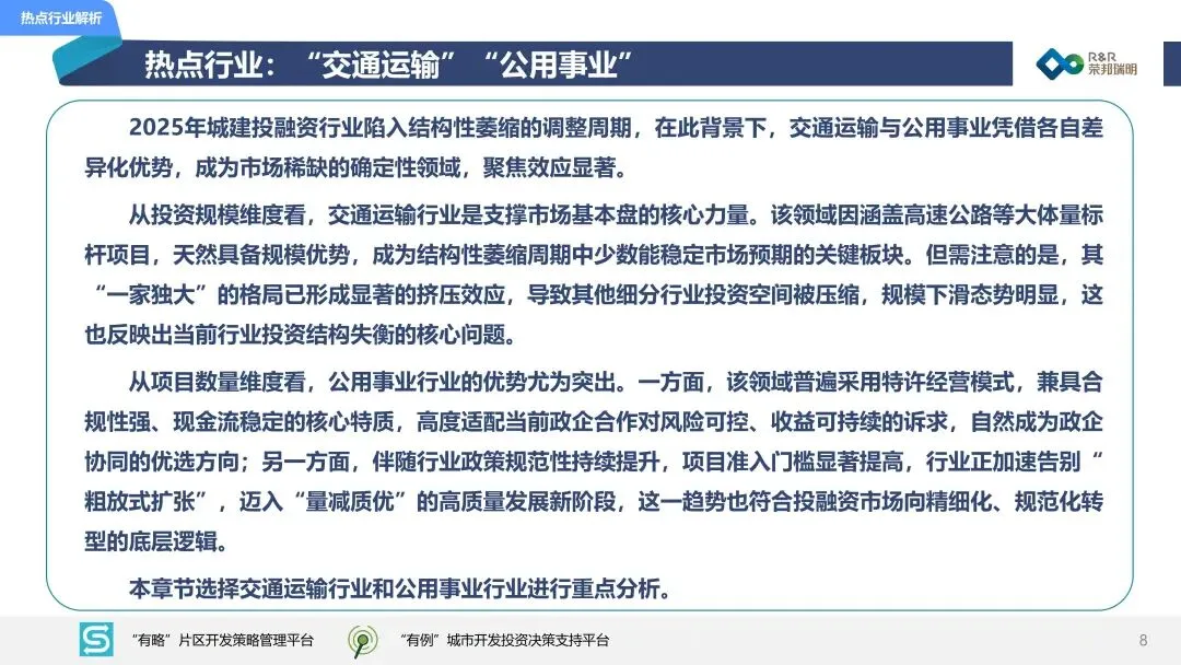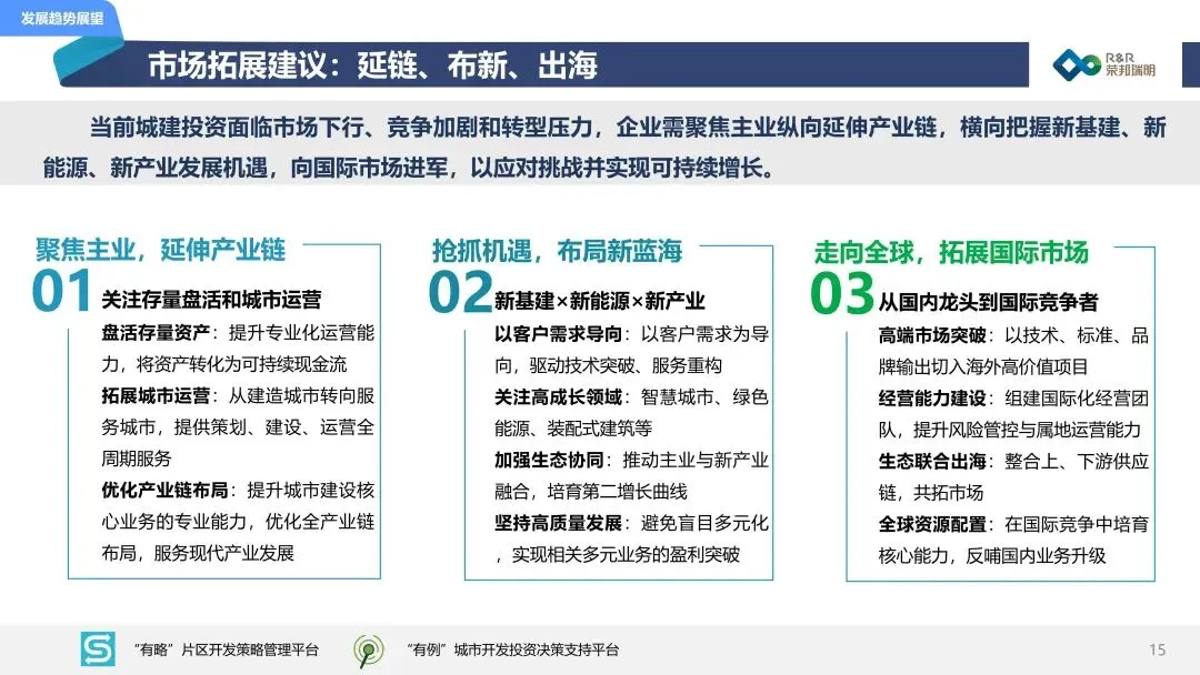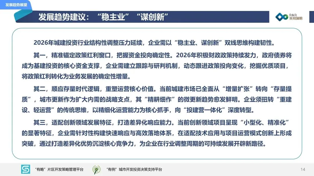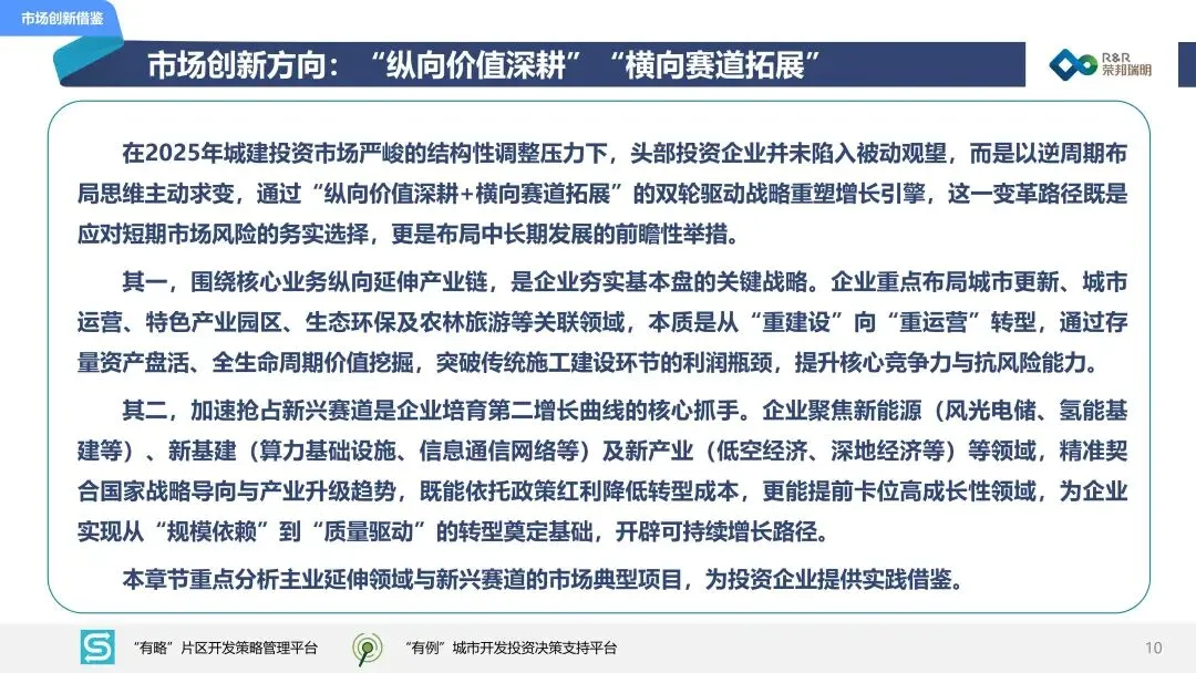 站在行业周期视角,当前城建投融资市场已进入收缩周期,企业创新求变刻不容缓,需从三方面重塑增长引擎:一是锚定政府债券支持、资金保障到位的项目巩固基本盘;二是纵向延伸产业链至运营环节,提升价值创造与抗风险能力;三是横向拓展新产业、新能源、新基建等新兴赛道培育第二增长曲线,实现高质量发展转型。