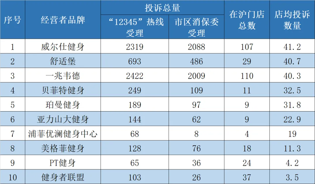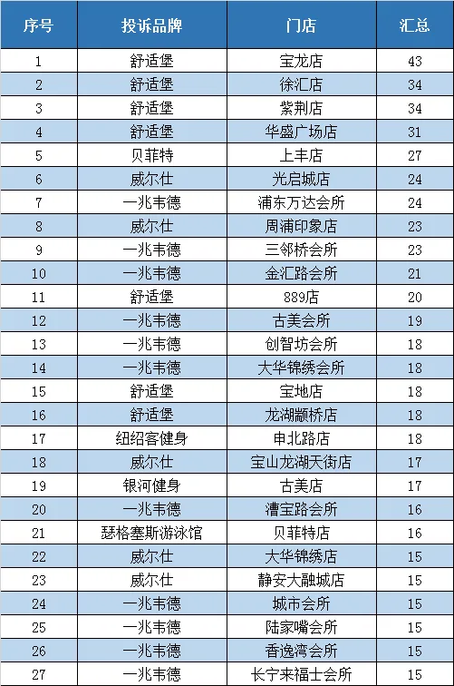 全年私教投诉超过15单的门店及品牌
