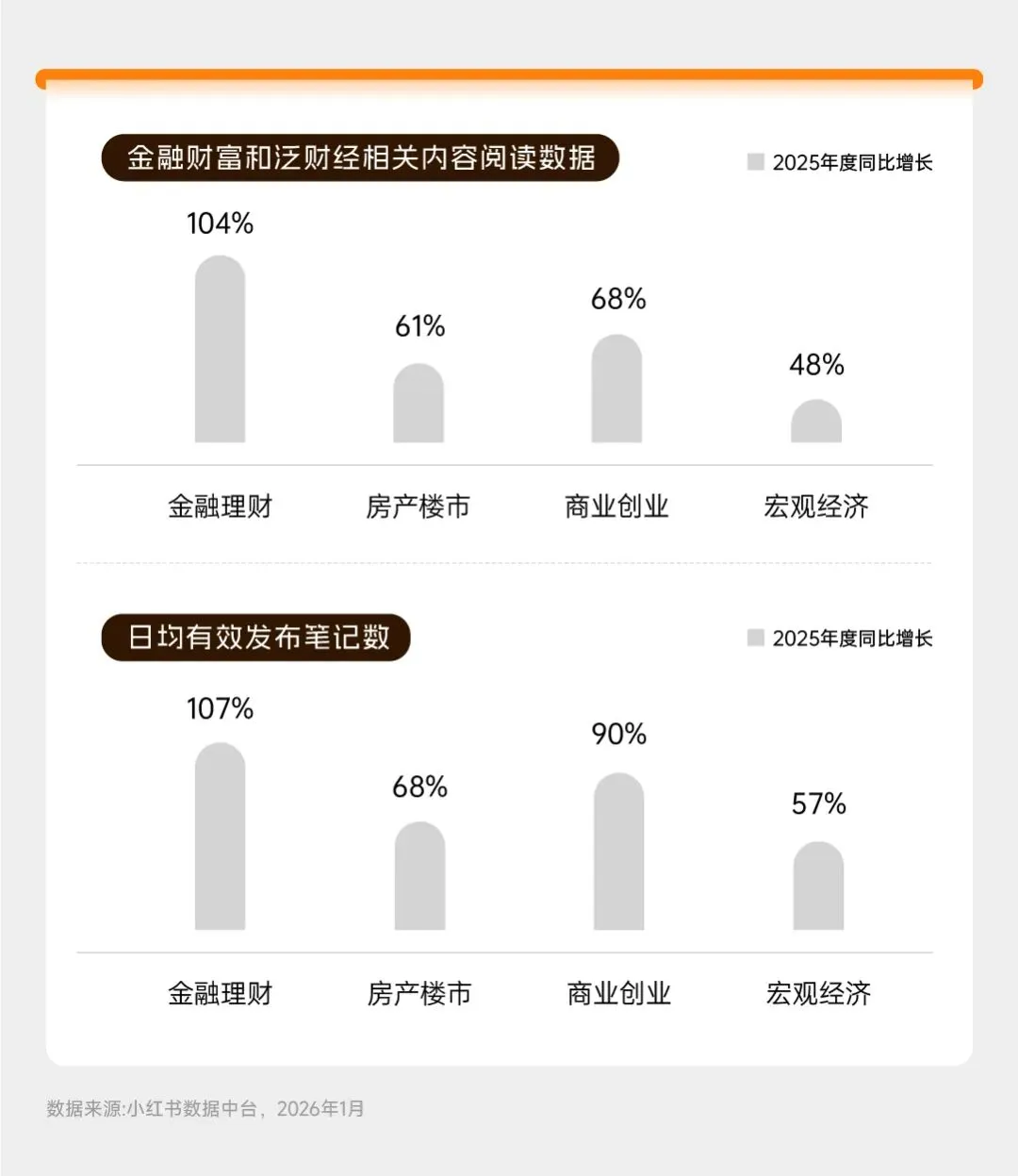首先,金融内容呈现爆发式增长。2025年小红书金融财富和泛财经相关内容类目快速增长,其中,“金融理财”相关笔记阅读数同比增长104%,日均有效发布数同比增长107%。