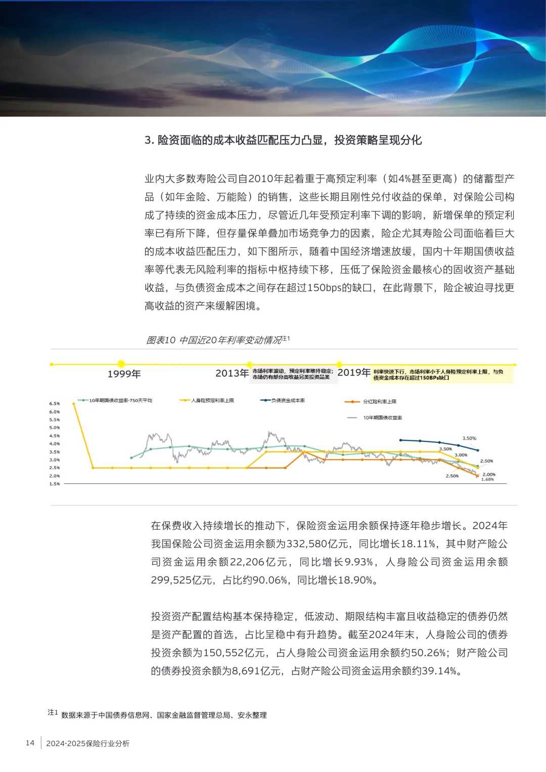 业内大多数寿险公司自2010年起着重于高预定利率(如4%甚至更高)的储蓄型产品(如年金险、万能险)的销售,这些长期且刚性兑付收益的保单,对保险公司构成了持续的资金成本压力,尽管近几年受预定利率下调的影响,新增保单的预定利率已有所下降,但存量保单叠加市场竞争力的因素,险企尤其寿险公司面临着巨大的成本收益匹配压力。