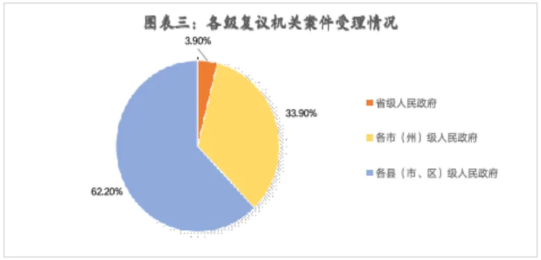 从层级分布上看,超九成案件由市(州)、县两级人民政府受理。全省各级行政复议机关受理的2056件行政复议案件中,省级人民政府受理81件,占3.9%;各市(州)人民政府受理696件,占33.9%;各县(市、区)人民政府受理1279件,占62.2%。(图表三)