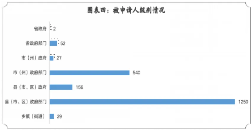 从被申请人分布上看,县(市、区)政府部门为被申请人的情况过半数。受理的行政复议案件中,被申请人是省政府及省政府部门的案件54件,占2.6%,其中,省政府2件,省政府部门52件;被申请人是市(州)政府及市(州)政府部门的案件567件,占27.6%,其中,市(州)政府27件,市(州)政府部门540件;被申请人是县(市、区)政府及县(市、区)政府部门的案件1406件,占68.4%,其中,县(市、区)政府156件,县(市、区)政府部门1250件;乡镇(街道)作为行政复议被申请人的案件29件,占1.4%。(图表四)