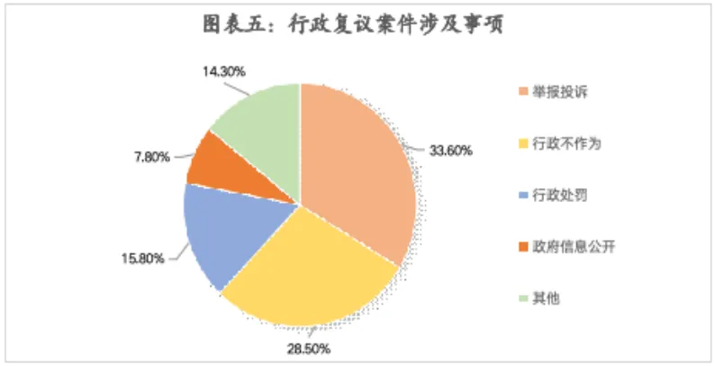 从行政行为事项上看,行政争议仍集中在投诉举报、行政不作为、行政处罚、信息公开等方面。其中,举报投诉690件,占33.6%,行政不作为587件,占28.5%,行政处罚325件,占15.8%,政府信息公开161件,占7.8%,其他案件293件,占14.3%。(图表五)