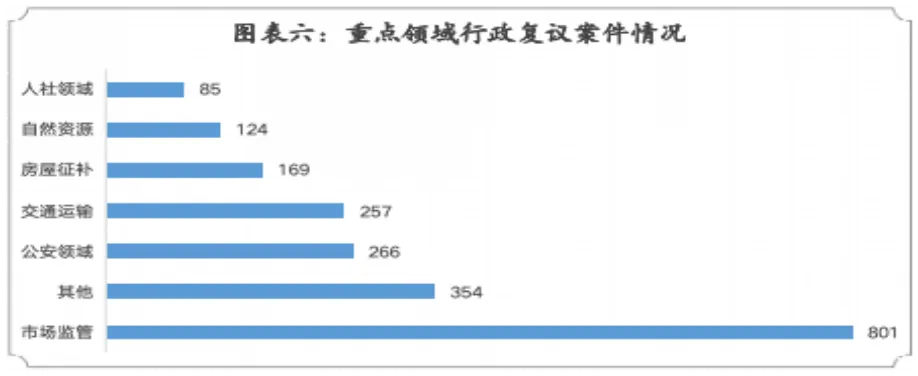 从行政管理领域上看,市场监管、公安、交通运输、房屋征补、自然资源系高发领域。其中,市场监管801件、公安领域266件、交通运输257件、房屋征补169件、自然资源124件、人力资源社会保障85件、其他354件。(图表六)