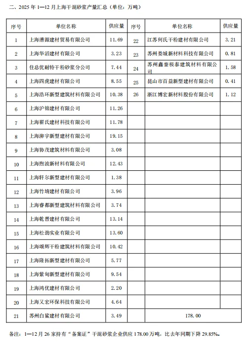 预拌混凝土:2025年1—12月146家持有“备案证”混凝土搅拌站,共完成4931.25万m3,比去年同期下降14.38%。其中,国营企业完成2797.40万m3 ,市场占有率56.73%,民营企业完成2133.85万 m3,市场占有率43.27%。国营企业市场占有率比去年同期有一定下降,民营企业市场占有率有一定上升。