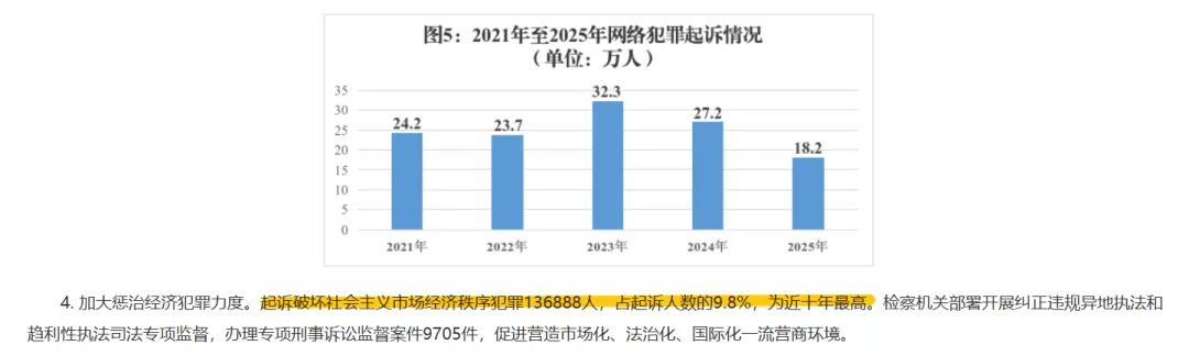 有趣的是,白皮书透露出一个矛盾的信号:一方面,2025年全国刑事犯罪案件总量在下降;但另一方面,破坏市场经济秩序的犯罪,起诉人数却创下近十年新高!