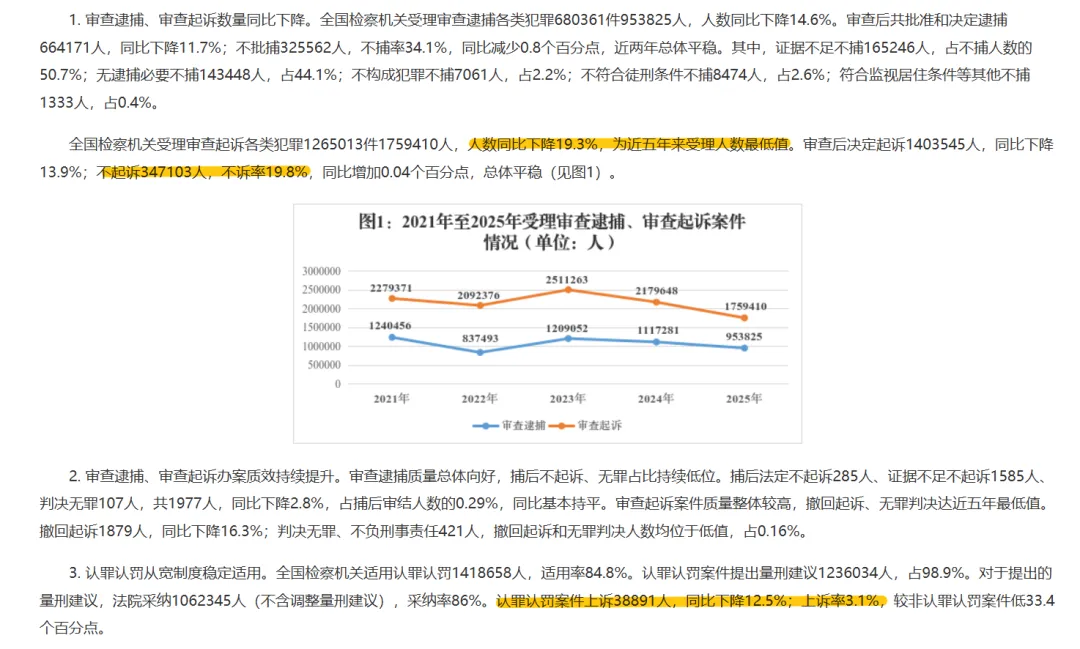 白皮书显示,2025年全国检察机关受理审查逮捕、审查起诉的人数,同比分别下降了14.6%和19.3%,是近五年来的最低值。同时,“不捕率”和“不诉率”保持稳定,认罪认罚从宽制度适用率高达84.8%。