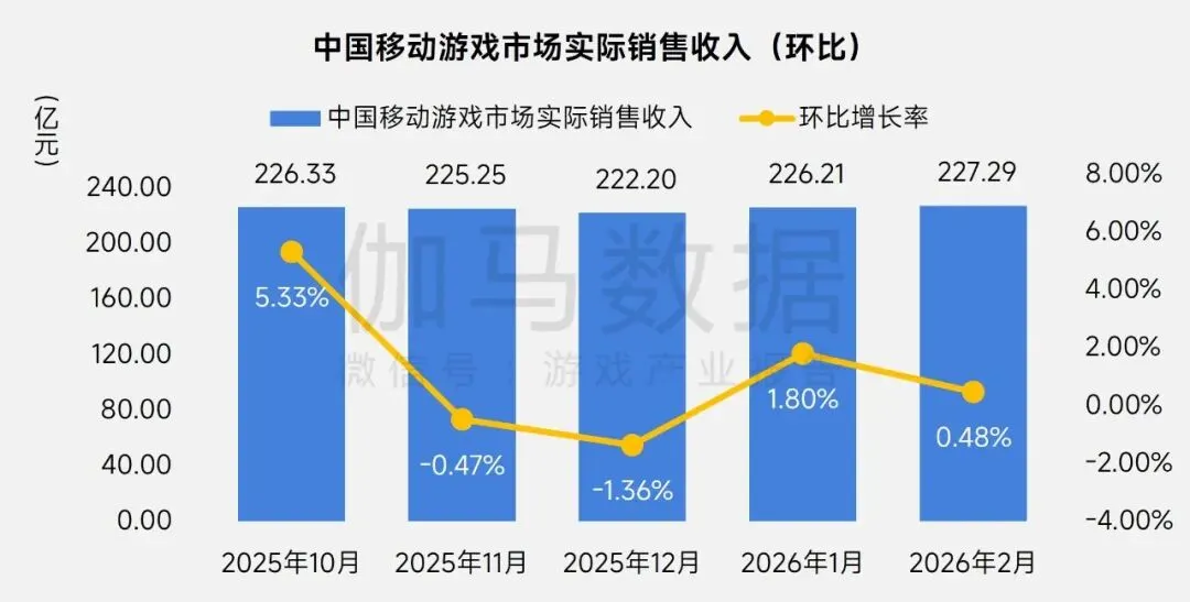 2026年2月,中国移动游戏市场实际销售收入达227.29亿元,环比增长0.48%,同比增长9.05%。