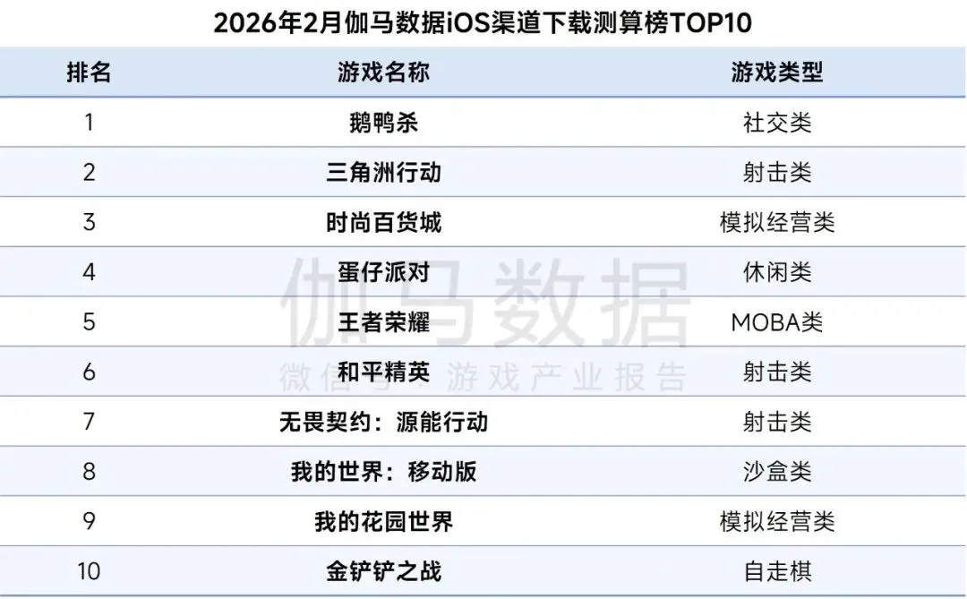 2026年2月伽马数据iOS渠道下载测算榜TOP10中,《鹅鸭杀》蝉联榜首,上月新品《时尚百货城》进入TOP3。