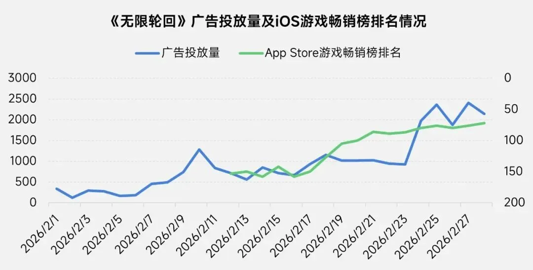 2026年2月《无限轮回》游戏广告投放量整体呈上升趋势,其在iOS游戏畅销榜排名亦逐渐升高。从投放的广告形式来看,奖励式视频是主要形式,占统计日期内广告投放量的58.6%,另外,信息流、横幅及原生广告分别占24.8%、8.2%及7.8%。