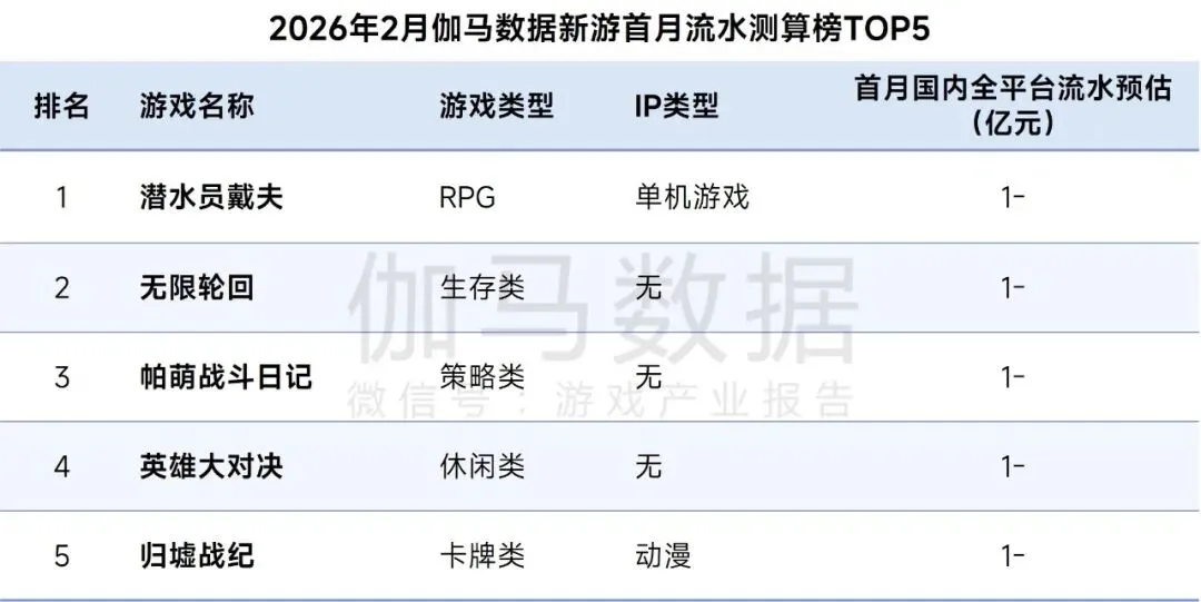 2026年2月,伽马数据新游首月流水测算榜中,《潜水员戴夫》位列榜首;本月新游整体表现不佳,首月流水预估均不超1亿元。