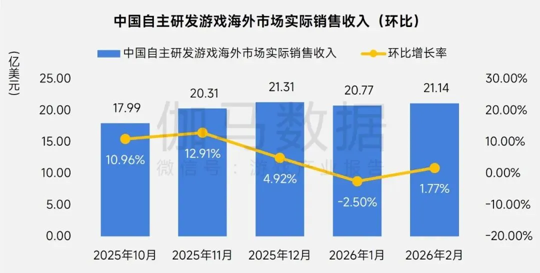 2026年2月,中国自主研发游戏在海外市场的实际销售收入达到21.14亿美元,环比增长1.77%,同比增长40.46%。