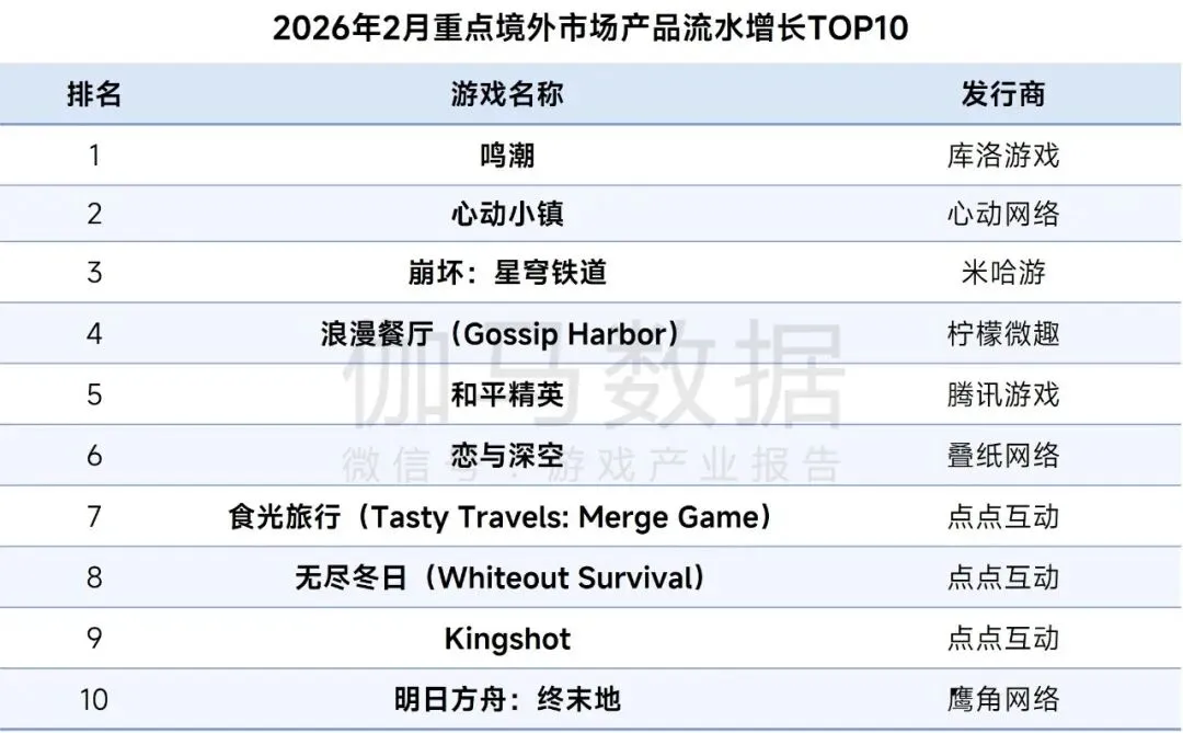 2026年2月重点境外市场产品流水增长TOP10中,《鸣潮》位列榜首,《心动小镇》《崩坏:星穹铁道》同样进入TOP3。